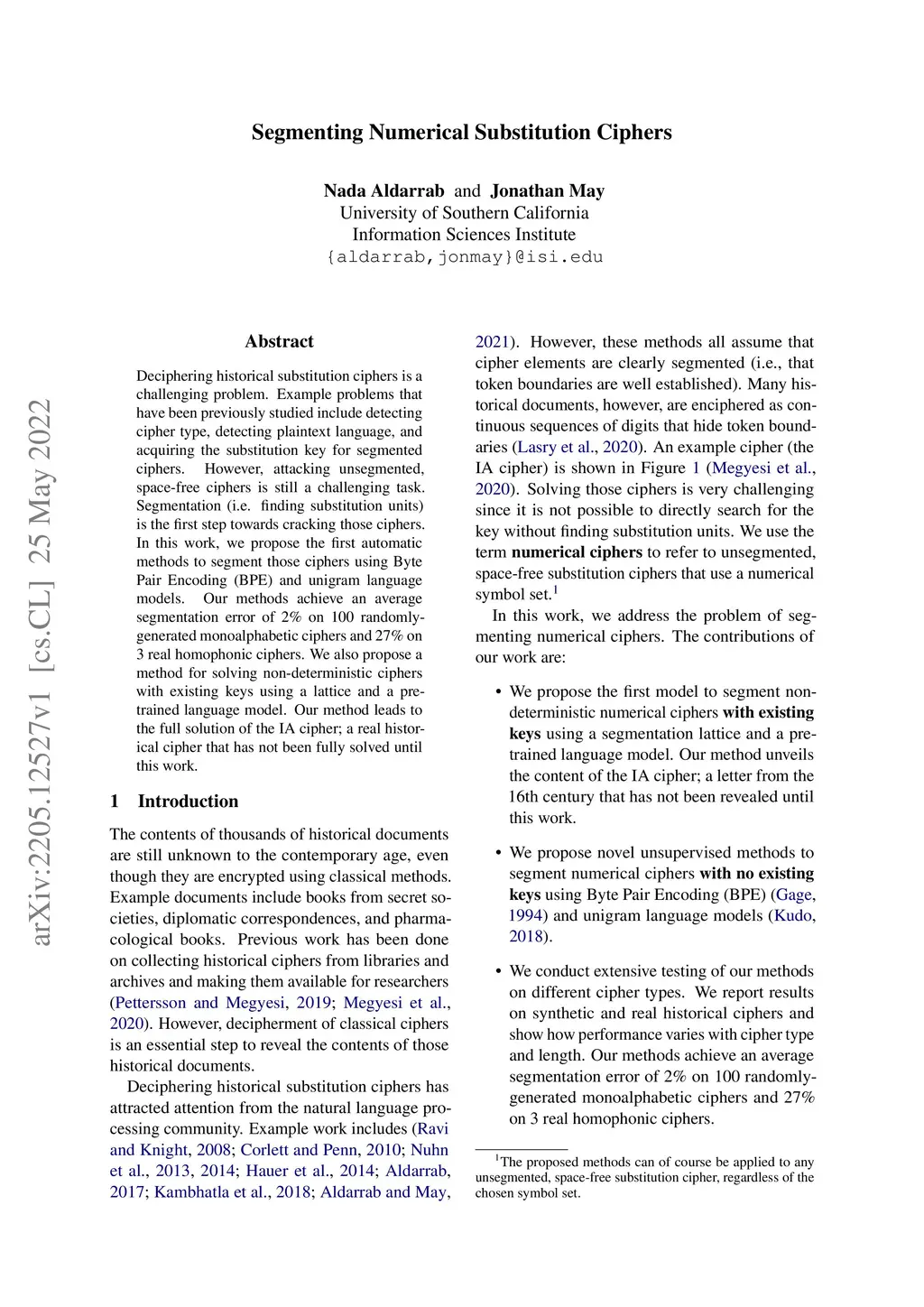 Deciphering historical substitution ciphers is a challenging problem. Example problems that have been previously studied include detecting cipher type, detecting plaintext language, and acquiring the substitution key for segmented ciphers. However, attacking unsegmented, space-free ciphers is still a challenging task. Segmentation (i.e. finding substitution units) is the first step towards cracking those ciphers. In this work, we propose the first automatic methods to segment those ciphers using Byte Pair Encoding (BPE) and unigram language models. Our methods achieve an average segmentation error of 2\% on 100 randomly-generated monoalphabetic ciphers and 27\% on 3 real homophonic ciphers. We also propose a method for solving non-deterministic ciphers with existing keys using a lattice and a pretrained language model. Our method leads to the full solution of the IA cipher; a real historical cipher that has not been fully solved until this work.
