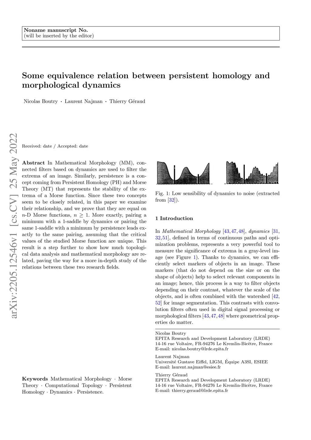 In Mathematical Morphology (MM), connected filters based on dynamics are used to filter the extrema of an image. Similarly, persistence is a concept coming from Persistent Homology (PH) and Morse Theory (MT) that represents the stability of the extrema of a Morse function. Since these two concepts seem to be closely related, in this paper we examine their relationship, and we prove that they are equal on n-D Morse functions, n 1. More exactly, pairing a minimum with a 1-saddle by dynamics or pairing the same 1-saddle with a minimum by persistence leads exactly to the same pairing, assuming that the critical values of the studied Morse function are unique. This result is a step further to show how much topological data analysis and mathematical morphology are related, paving the way for a more in-depth study of the relations between these two research fields.
