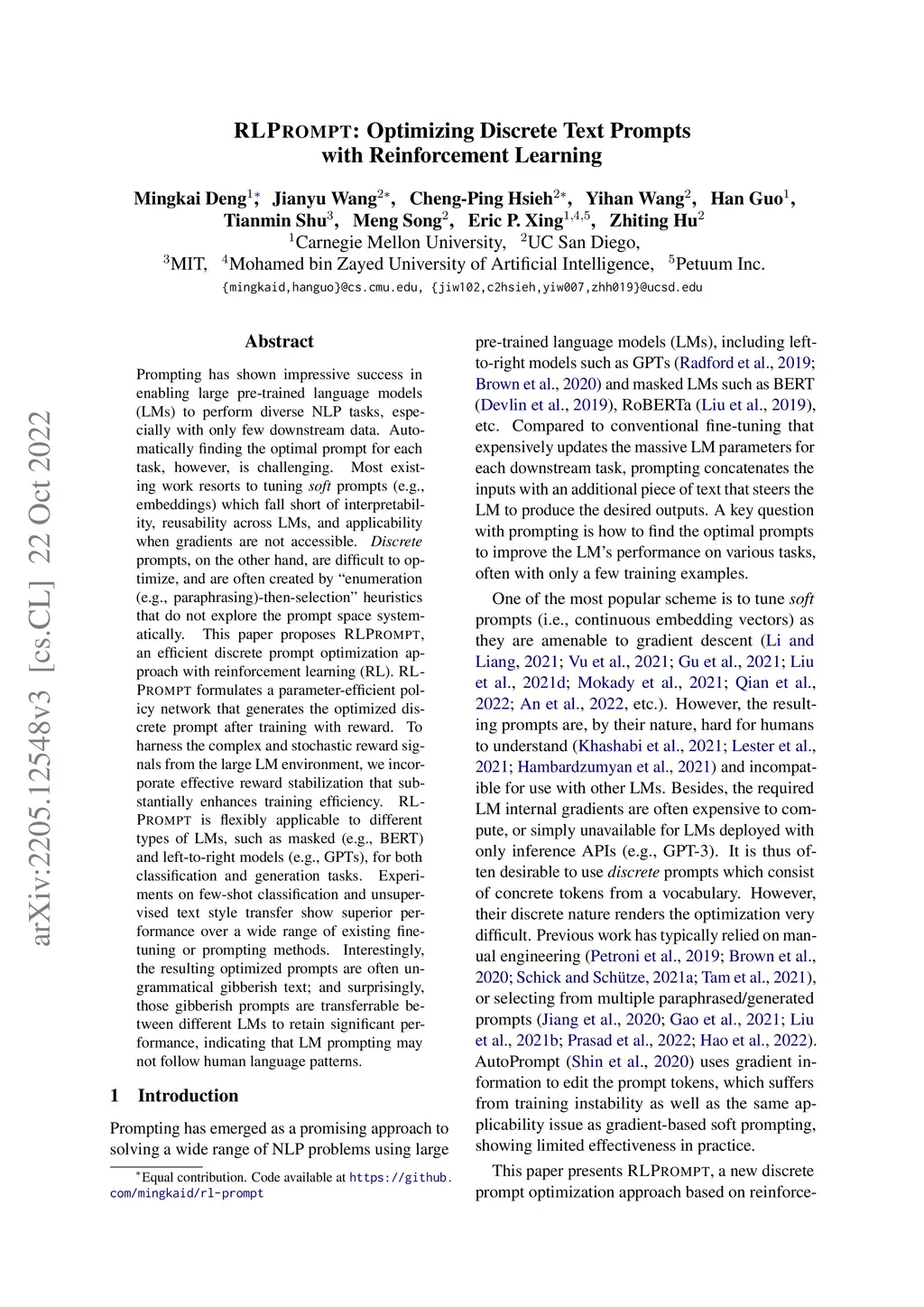 RLPrompt: Optimizing Discrete Text Prompts with Reinforcement Learning