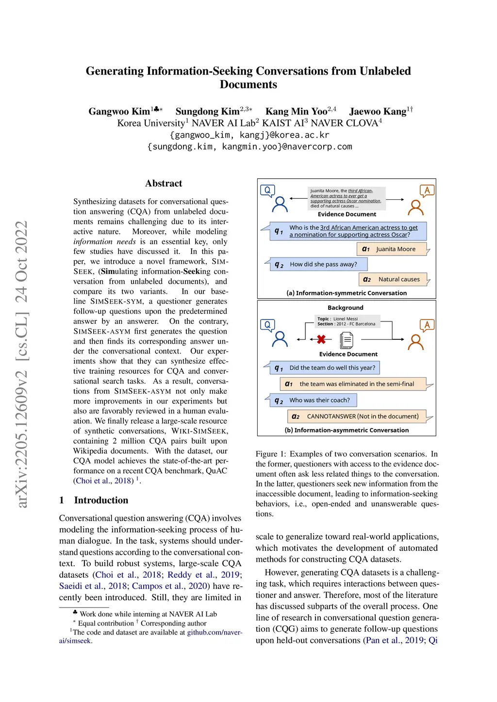 In this paper, we introduce a novel framework SimSeek (simulating information-seeking conversation from unlabeled documents) and compare two variants of it to provide a deeper perspective into the information-seeking behavior. We first introduce a strong simulator for information-symmetric conversation, SimSeek-sym, where questioner and answerer share all knowledge when conversing with one another. Although it simulates reasonable conversations, we take a further step toward more realistic information-seeking conversation. Hence, we propose SimSeek-asym that assumes information asymmetry between two agents, which encourages the questioner to seek new information from an inaccessible document. In our experiments, we demonstrate that SimSeek-asym successfully generates information-seeking conversations for two downstream tasks, CQA and conversational search. In particular, SimSeek-asym improves baseline models by 1.1-1.9 F1 score in QuAC, and by 1.1 of MRR in OR-QuAC. Moreover, we thoroughly analyze our synthetic datasets to identify crucial factors for realistic information-seeking conversation.