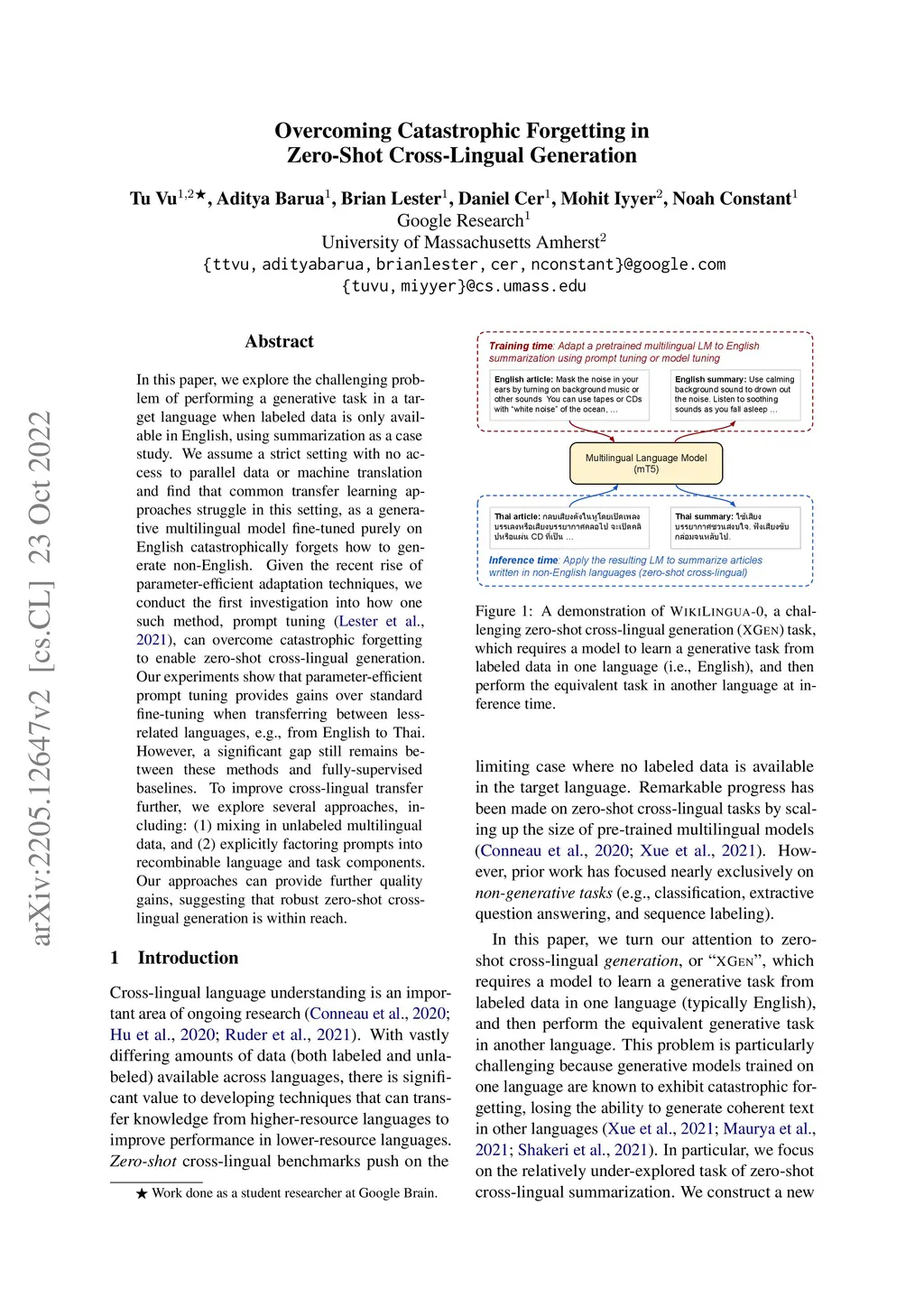In this paper, we explore the challenging problem of performing a generative task in a target language when labeled data is only available in English, using summarization as a case study. We assume a strict setting with no access to parallel data or machine translation and find that common transfer learning approaches struggle in this setting, as a generative multilingual model fine-tuned purely on English catastrophically forgets how to generate non-English. Given the recent rise of parameter-efficient adaptation techniques, we conduct the first investigation into how one such method, prompt tuning (Lester et al., 2021), can overcome catastrophic forgetting to enable zero-shot cross-lingual generation. Our experiments show that parameter-efficient prompt tuning provides gains over standard fine-tuning when transferring between less-related languages, e.g., from English to Thai. However, a significant gap still remains between these methods and fully-supervised baselines. To improve cross-lingual transfer further, we explore several approaches, including: (1) mixing in unlabeled multilingual data, and (2) explicitly factoring prompts into recombinable language and task components. Our approaches can provide further quality gains, suggesting that robust zero-shot cross-lingual generation is within reach.