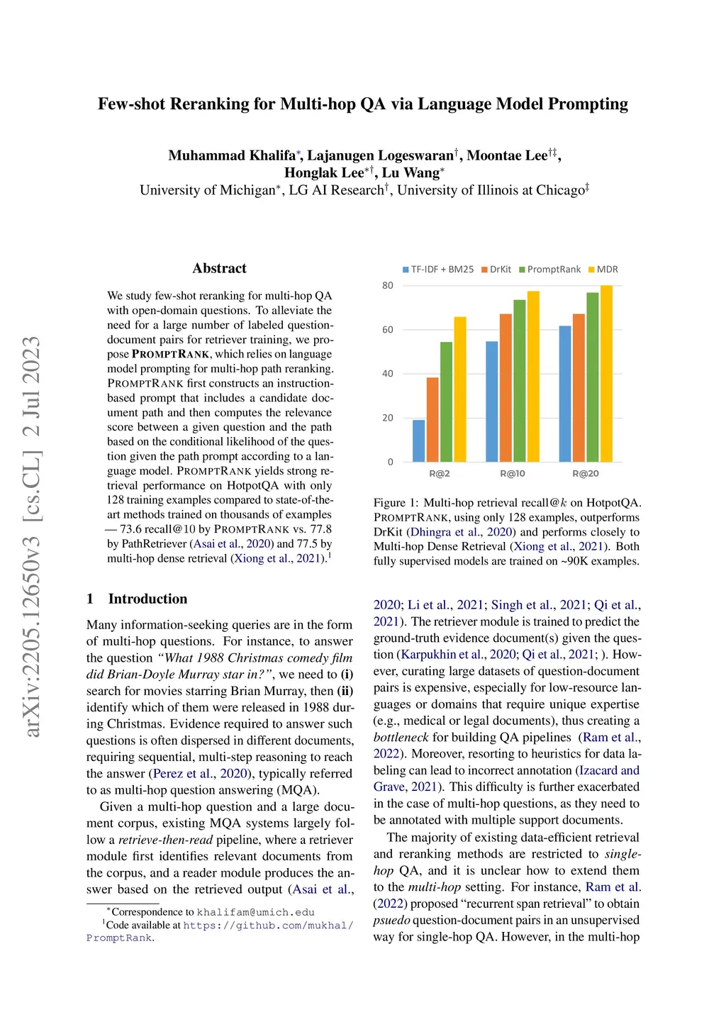 Few-shot Reranking for Multi-hop QA via Language Model Prompting
