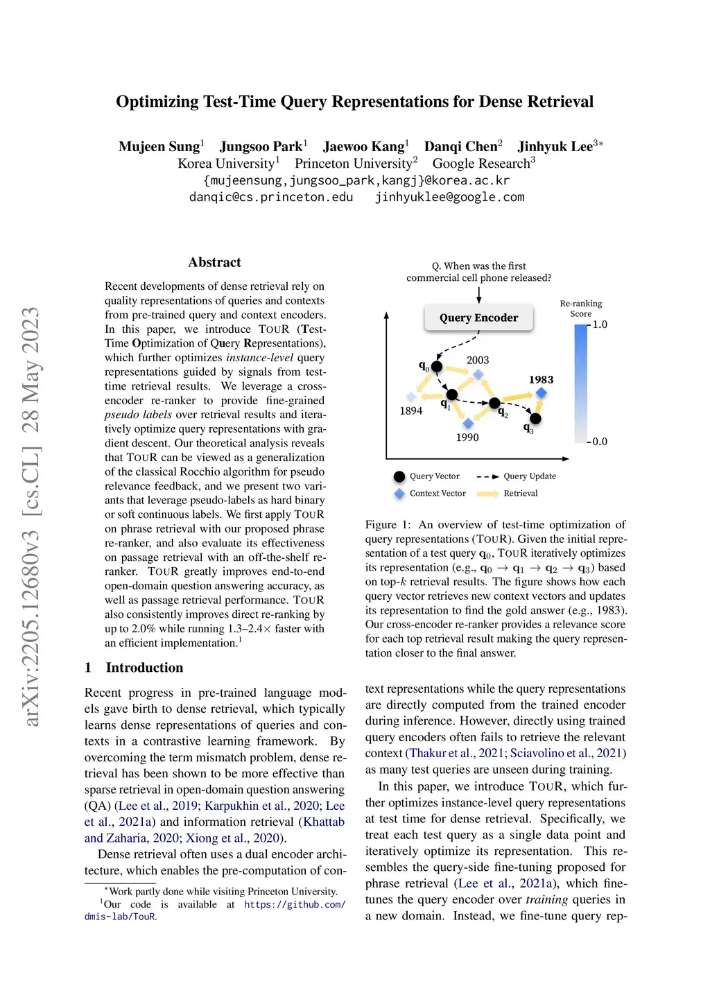 Recent developments of dense retrieval rely on quality representations of queries and contexts from pre-trained query and context encoders. In this paper, we introduce TOUR (Test-Time Optimization of Query Representations), which further optimizes instance-level query representations guided by signals from test-time retrieval results. We leverage a cross-encoder re-ranker to provide fine-grained pseudo labels over retrieval results and iteratively optimize query representations with gradient descent. Our theoretical analysis reveals that TOUR can be viewed as a generalization of the classical Rocchio algorithm for pseudo relevance feedback, and we present two variants that leverage pseudo-labels as hard binary or soft continuous labels. We first apply TOUR on phrase retrieval with our proposed phrase re-ranker, and also evaluate its effectiveness on passage retrieval with an off-the-shelf re-ranker. TOUR greatly improves end-to-end open-domain question answering accuracy, as well as passage retrieval performance. TOUR also consistently improves direct re-ranking by up to 2.0% while running 1.3-2.4x faster with an efficient implementation.
