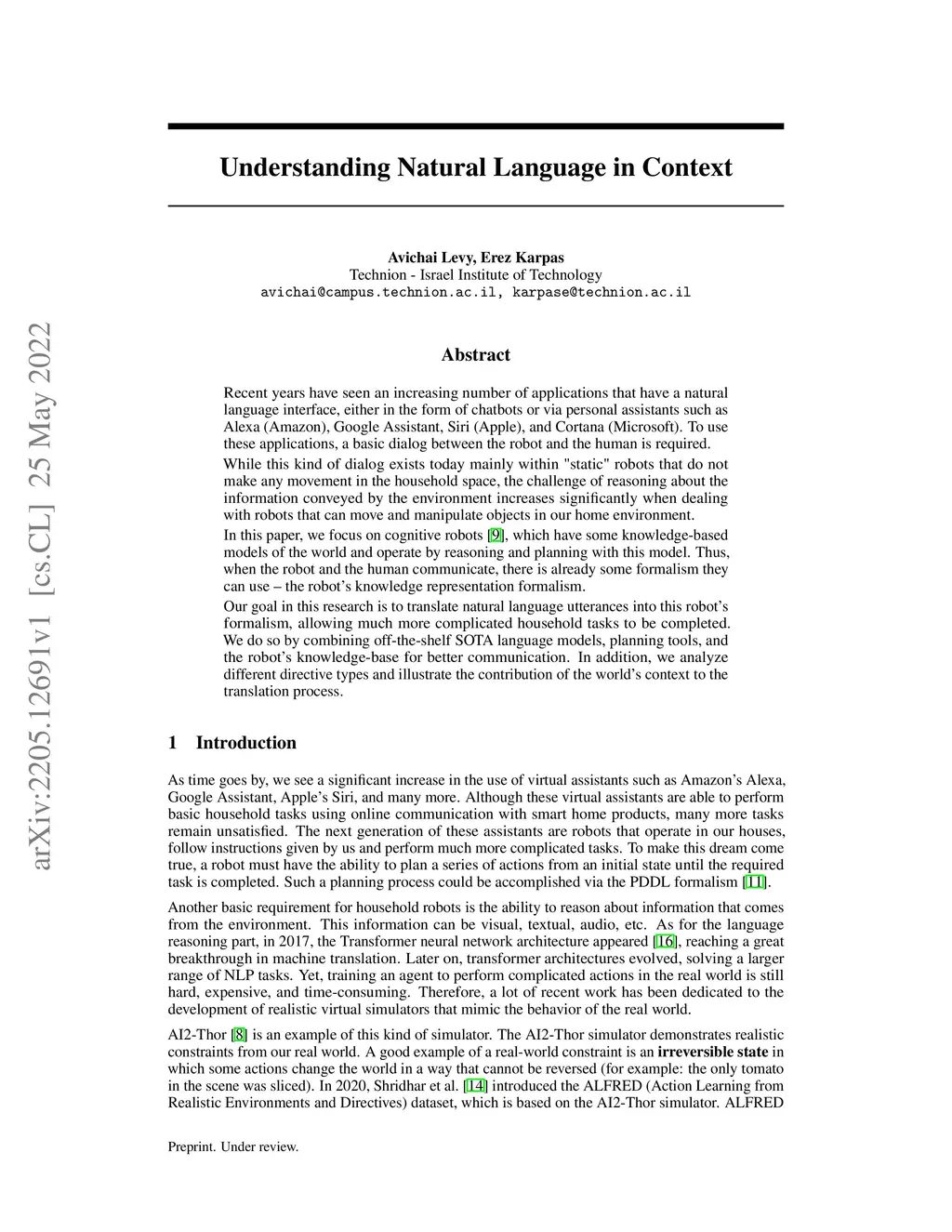 Recent years have seen an increasing number of applications that have a natural language interface, either in the form of chatbots or via personal assistants such as Alexa (Amazon), Google Assistant, Siri (Apple), and Cortana (Microsoft). To use these applications, a basic dialog between the robot and the human is required. While this kind of dialog exists today mainly within "static" robots that do not make any movement in the household space, the challenge of reasoning about the information conveyed by the environment increases significantly when dealing with robots that can move and manipulate objects in our home environment. In this paper, we focus on cognitive robots, which have some knowledge-based models of the world and operate by reasoning and planning with this model. Thus, when the robot and the human communicate, there is already some formalism they can use - the robot's knowledge representation formalism. Our goal in this research is to translate natural language utterances into this robot's formalism, allowing much more complicated household tasks to be completed. We do so by combining off-the-shelf SOTA language models, planning tools, and the robot's knowledge-base for better communication. In addition, we analyze different directive types and illustrate the contribution of the world's context to the translation process.