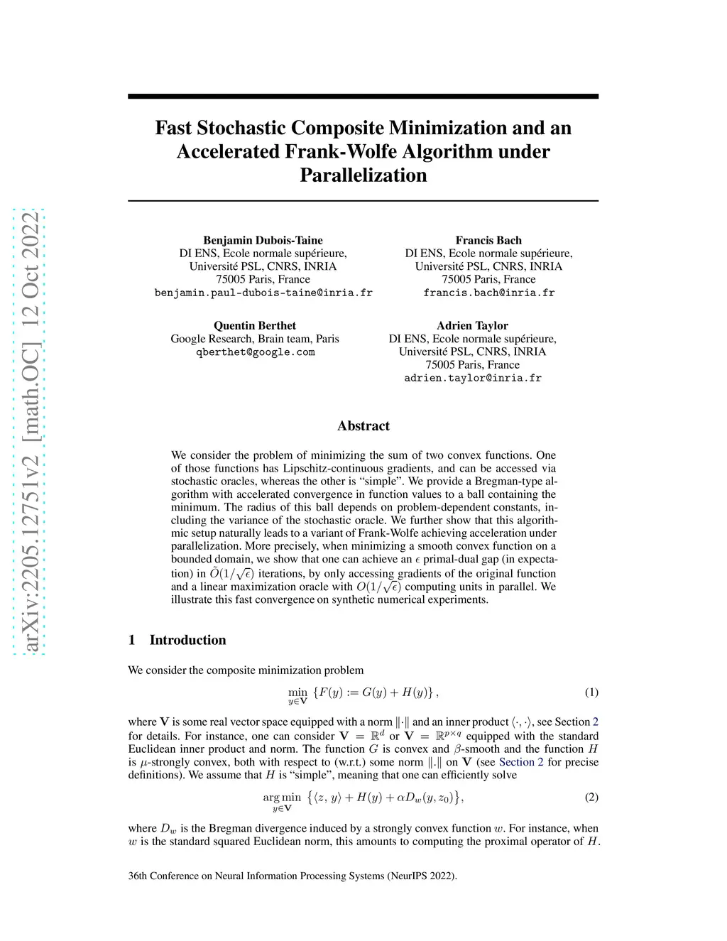 We consider the problem of minimizing the sum of two convex functions. One of those functions has Lipschitz-continuous gradients, and can be accessed via stochastic oracles, whereas the other is "simple". We provide a Bregman-type algorithm with accelerated convergence in function values to a ball containing the minimum. The radius of this ball depends on problem-dependent constants, including the variance of the stochastic oracle. We further show that this algorithmic setup naturally leads to a variant of Frank-Wolfe achieving acceleration under parallelization. More precisely, when minimizing a smooth convex function on a bounded domain, we show that one can achieve an primal-dual gap (in expectation) in iterations, by only accessing gradients of the original function and a linear maximization oracle with computing units in parallel. We illustrate this fast convergence on synthetic numerical experiments.