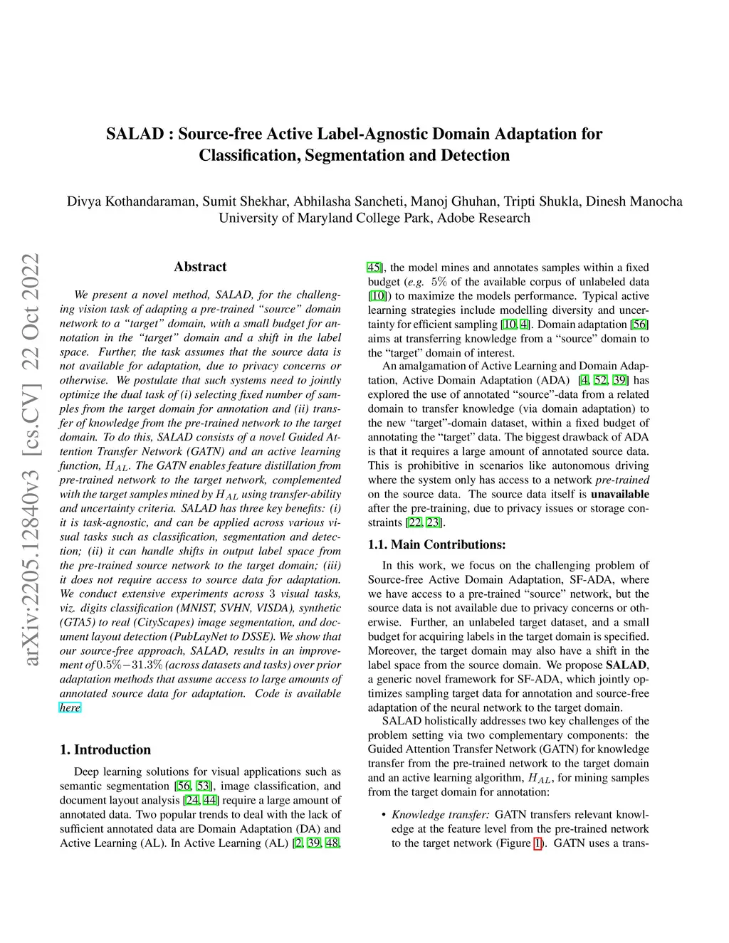 We present a novel method, SALAD, for the challenging vision task of adapting a pre-trained "source" domain network to a "target" domain, with a small budget for annotation in the "target" domain and a shift in the label space. Further, the task assumes that the source data is not available for adaptation, due to privacy concerns or otherwise. We postulate that such systems need to jointly optimize the dual task of (i) selecting fixed number of samples from the target domain for annotation and (ii) transfer of knowledge from the pre-trained network to the target domain. To do this, SALAD consists of a novel Guided Attention Transfer Network (GATN) and an active learning function, HAL. The GATN enables feature distillation from pre-trained network to the target network, complemented with the target samples mined by HAL using transfer-ability and uncertainty criteria. SALAD has three key benefits: (i) it is task-agnostic, and can be applied across various visual tasks such as classification, segmentation and detection; (ii) it can handle shifts in output label space from the pre-trained source network to the target domain; (iii) it does not require access to source data for adaptation. We conduct extensive experiments across 3 visual tasks, viz. digits classification (MNIST, SVHN, VISDA), synthetic (GTA5) to real (CityScapes) image segmentation, and document layout detection (PubLayNet to DSSE). We show that our source-free approach, SALAD, results in an improvement of 0.5%-31.3%(across datasets and tasks) over prior adaptation methods that assume access to large amounts of annotated source data for adaptation.