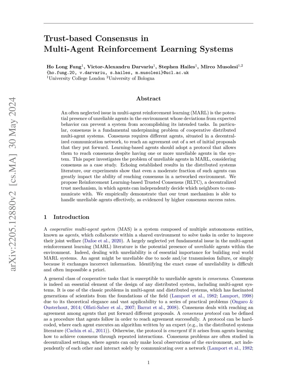 An often neglected issue in multi-agent reinforcement learning (MARL) is the potential presence of unreliable agents in the environment whose deviations from expected behavior can prevent a system from accomplishing its intended tasks. In particular, consensus is a fundamental underpinning problem of cooperative distributed multi-agent systems. Consensus requires different agents, situated in a decentralized communication network, to reach an agreement out of a set of initial proposals that they put forward. Learning-based agents should adopt a protocol that allows them to reach consensus despite having one or more unreliable agents in the system. This paper investigates the problem of unreliable agents in MARL, considering consensus as a case study. Echoing established results in the distributed systems literature, our experiments show that even a moderate fraction of such agents can greatly impact the ability of reaching consensus in a networked environment. We propose Reinforcement Learning-based Trusted Consensus (RLTC), a decentralized trust mechanism, in which agents can independently decide which neighbors to communicate with. We empirically demonstrate that our trust mechanism is able to handle unreliable agents effectively, as evidenced by higher consensus success rates.