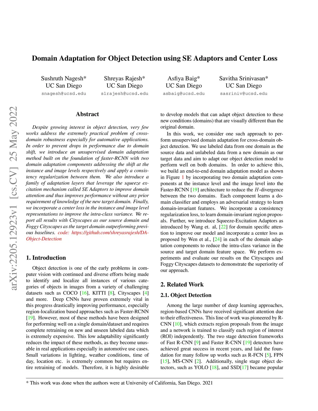 Domain Adaptation for Object Detection using SE Adaptors and Center Loss