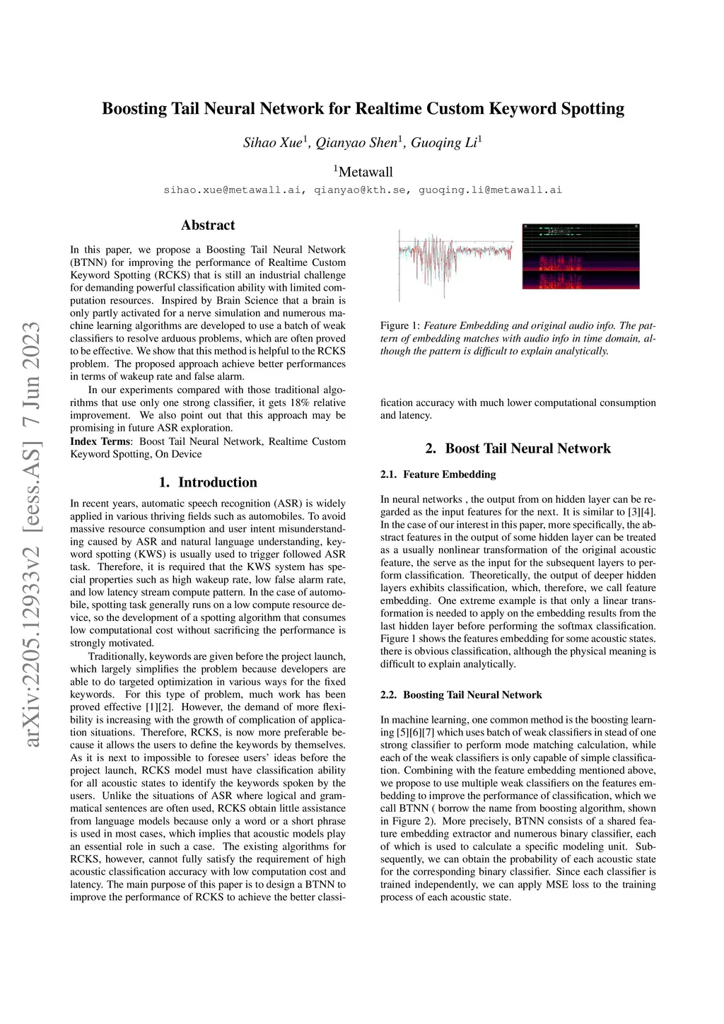In this paper, we propose a Boosting Tail Neural Network (BTNN) for improving the performance of Realtime Custom Keyword Spotting (RCKS) that is still an industrial challenge for demanding powerful classification ability with limited computation resources. Inspired by Brain Science that a brain is only partly activated for a nerve simulation and numerous machine learning algorithms are developed to use a batch of weak classifiers to resolve arduous problems, which are often proved to be effective. We show that this method is helpful to the RCKS problem. The proposed approach achieve better performances in terms of wakeup rate and false alarm. In our experiments compared with those traditional algorithms that use only one strong classifier, it gets 18\% relative improvement. We also point out that this approach may be promising in future ASR exploration.