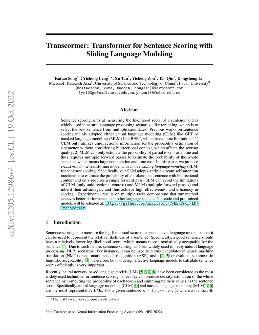 Sentence scoring aims at measuring the likelihood score of a sentence and is widely used in many natural language processing scenarios, like reranking, which is to select the best sentence from multiple candidates. Previous works on sentence scoring mainly adopted either causal language modeling (CLM) like GPT or masked language modeling (MLM) like BERT, which have some limitations: 1) CLM only utilizes unidirectional information for the probability estimation of a sentence without considering bidirectional context, which affects the scoring quality; 2) MLM can only estimate the probability of partial tokens at a time and thus requires multiple forward passes to estimate the probability of the whole sentence, which incurs large computation and time cost. In this paper, we propose \textit{Transcormer} -- a Transformer model with a novel \textit{sliding language modeling} (SLM) for sentence scoring. Specifically, our SLM adopts a triple-stream self-attention mechanism to estimate the probability of all tokens in a sentence with bidirectional context and only requires a single forward pass. SLM can avoid the limitations of CLM (only unidirectional context) and MLM (multiple forward passes) and inherit their advantages, and thus achieve high effectiveness and efficiency in scoring. Experimental results on multiple tasks demonstrate that our method achieves better performance than other language modelings.