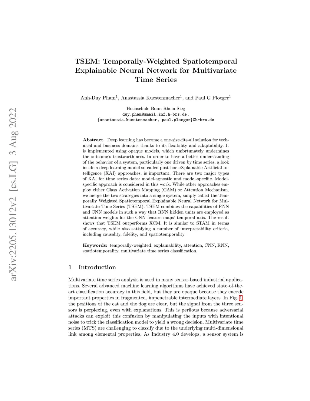 Deep learning has become a one-size-fits-all solution for technical and business domains thanks to its flexibility and adaptability. It is implemented using opaque models, which unfortunately undermines the outcome trustworthiness. In order to have a better understanding of the behavior of a system, particularly one driven by time series, a look inside a deep learning model so-called posthoc eXplainable Artificial Intelligence (XAI) approaches, is important. There are two major types of XAI for time series data, namely model-agnostic and model-specific. Model-specific approach is considered in this work. While other approaches employ either Class Activation Mapping (CAM) or Attention Mechanism, we merge the two strategies into a single system, simply called the Temporally Weighted Spatiotemporal Explainable Neural Network for Multivariate Time Series (TSEM). TSEM combines the capabilities of RNN and CNN models in such a way that RNN hidden units are employed as attention weights for the CNN feature maps temporal axis. The result shows that TSEM outperforms XCM. It is similar to STAM in terms of accuracy, while also satisfying a number of interpretability criteria, including causality, fidelity, and spatiotemporality.