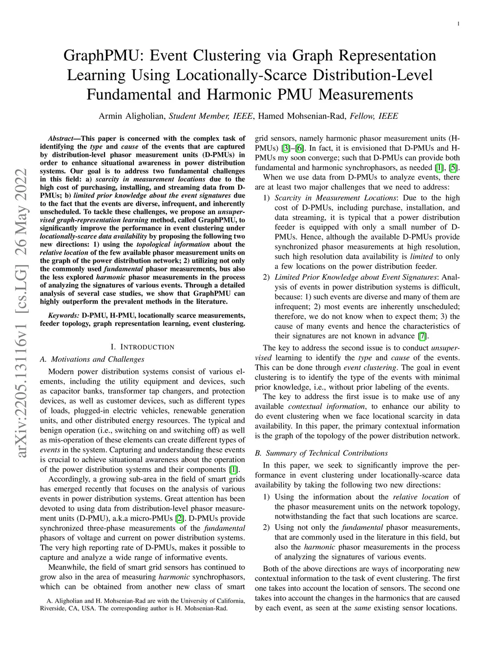 This paper is concerned with the complex task of identifying the type and cause of the events that are captured by distribution-level phasor measurement units (D-PMUs) in order to enhance situational awareness in power distribution systems. Our goal is to address two fundamental challenges in this field: a) scarcity in measurement locations due to the high cost of purchasing, installing, and streaming data from D-PMUs; b) limited prior knowledge about the event signatures due to the fact that the events are diverse, infrequent, and inherently unscheduled. To tackle these challenges, we propose an unsupervised graph-representation learning method, called GraphPMU, to significantly improve the performance in event clustering under locationally-scarce data availability by proposing the following two new directions: 1) using the topological information about the relative location of the few available phasor measurement units on the graph of the power distribution network; 2) utilizing not only the commonly used fundamental phasor measurements, bus also the less explored harmonic phasor measurements in the process of analyzing the signatures of various events. Through a detailed analysis of several case studies, we show that GraphPMU can highly outperform the prevalent methods in the literature.