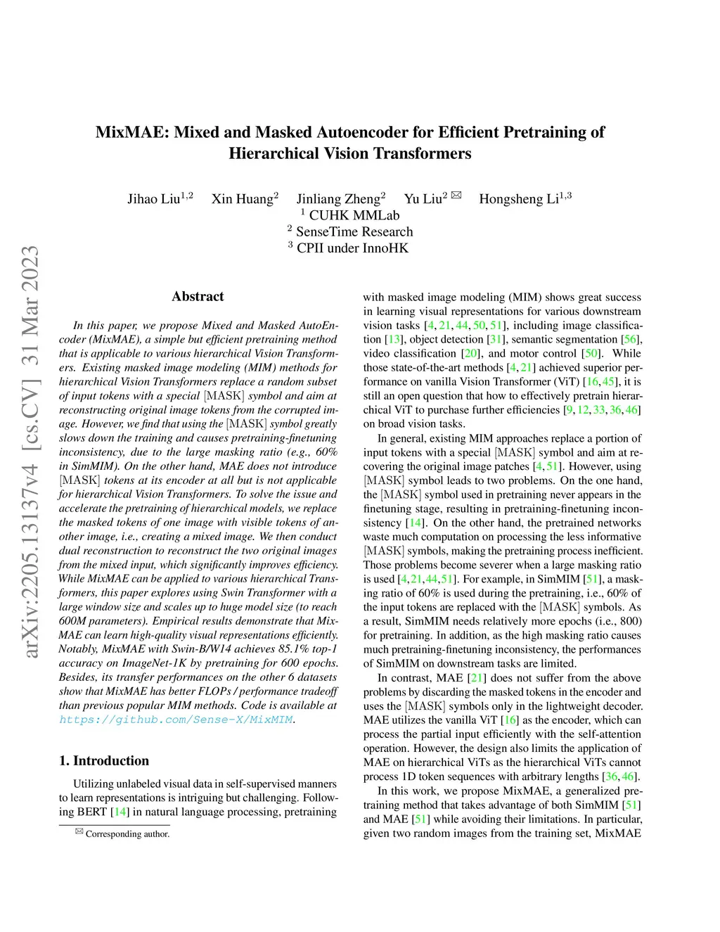 In this paper, we propose Mixed and Masked AutoEncoder (MixMAE), a simple but efficient pretraining method that is applicable to various hierarchical Vision Transformers. Existing masked image modeling (MIM) methods for hierarchical Vision Transformers replace a random subset of input tokens with a special [MASK] symbol and aim at reconstructing original image tokens from the corrupted image. However, we find that using the [MASK] symbol greatly slows down the training and causes pretraining-finetuning inconsistency, due to the large masking ratio (e.g., 60% in SimMIM). On the other hand, MAE does not introduce [MASK] tokens at its encoder at all but is not applicable for hierarchical Vision Transformers. To solve the issue and accelerate the pretraining of hierarchical models, we replace the masked tokens of one image with visible tokens of another image, i.e., creating a mixed image. We then conduct dual reconstruction to reconstruct the two original images from the mixed input, which significantly improves efficiency. While MixMAE can be applied to various hierarchical Transformers, this paper explores using Swin Transformer with a large window size and scales up to huge model size (to reach 600M parameters). Empirical results demonstrate that MixMAE can learn high-quality visual representations efficiently. Notably, MixMAE with Swin-B/W14 achieves 85.1% top-1 accuracy on ImageNet-1K by pretraining for 600 epochs. Besides, its transfer performances on the other 6 datasets show that MixMAE has better FLOPs / performance tradeoff than previous popular MIM methods. Code is available at https://github.com/Sense-X/MixMIM.
