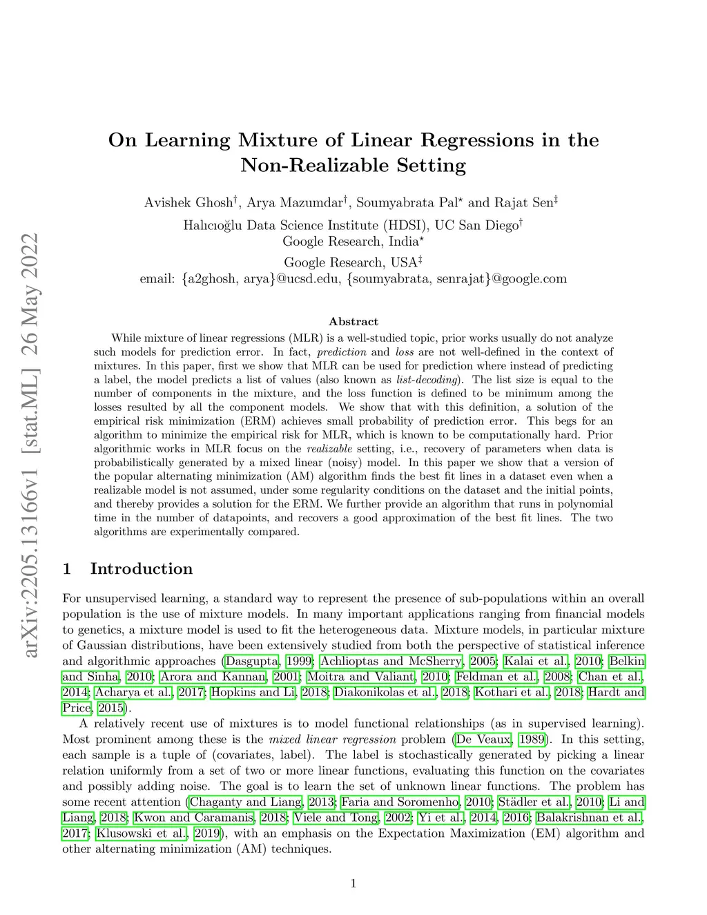 While mixture of linear regressions (MLR) is a well-studied topic, prior works usually do not analyze such models for prediction error. In fact, {\em prediction} and {\em loss} are not well-defined in the context of mixtures. In this paper, first we show that MLR can be used for prediction where instead of predicting a label, the model predicts a list of values (also known as {\em list-decoding}). The list size is equal to the number of components in the mixture, and the loss function is defined to be minimum among the losses resulted by all the component models. We show that with this definition, a solution of the empirical risk minimization (ERM) achieves small probability of prediction error. This begs for an algorithm to minimize the empirical risk for MLR, which is known to be computationally hard. Prior algorithmic works in MLR focus on the {\em realizable} setting, i.e., recovery of parameters when data is probabilistically generated by a mixed linear (noisy) model. In this paper we show that a version of the popular alternating minimization (AM) algorithm finds the best fit lines in a dataset even when a realizable model is not assumed, under some regularity conditions on the dataset and the initial points, and thereby provides a solution for the ERM. We further provide an algorithm that runs in polynomial time in the number of datapoints, and recovers a good approximation of the best fit lines. The two algorithms are experimentally compared.