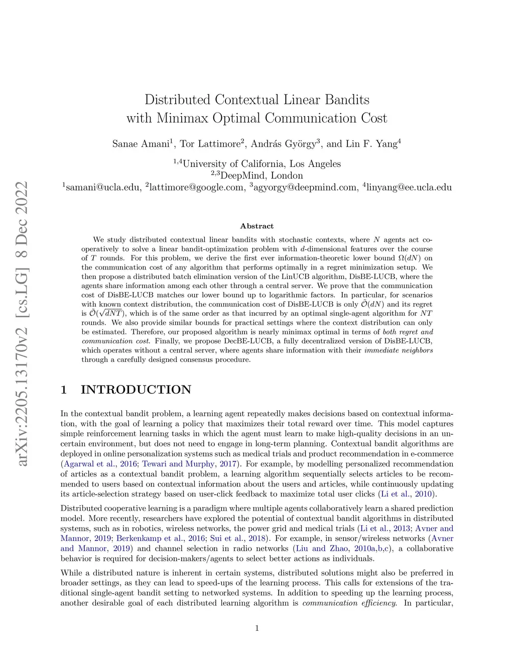 We study distributed contextual linear bandits with stochastic contexts, where agents act cooperatively to solve a linear bandit-optimization problem with -dimensional features over the course of rounds. For this problem, we derive the first ever information-theoretic lower bound on the communication cost of any algorithm that performs optimally in a regret minimization setup. We then propose a distributed batch elimination version of the LinUCB algorithm, DisBE-LUCB, where the agents share information among each other through a central server. We prove that the communication cost of DisBE-LUCB matches our lower bound up to logarithmic factors. In particular, for scenarios with known context distribution, the communication cost of DisBE-LUCB is only and its regret is , which is of the same order as that incurred by an optimal single-agent algorithm for rounds. We also provide similar bounds for practical settings where the context distribution can only be estimated. Therefore, our proposed algorithm is nearly minimax optimal in terms of \emph{both regret and communication cost}. Finally, we propose DecBE-LUCB, a fully decentralized version of DisBE-LUCB, which operates without a central server, where agents share information with their \emph{immediate neighbors} through a carefully designed consensus procedure.