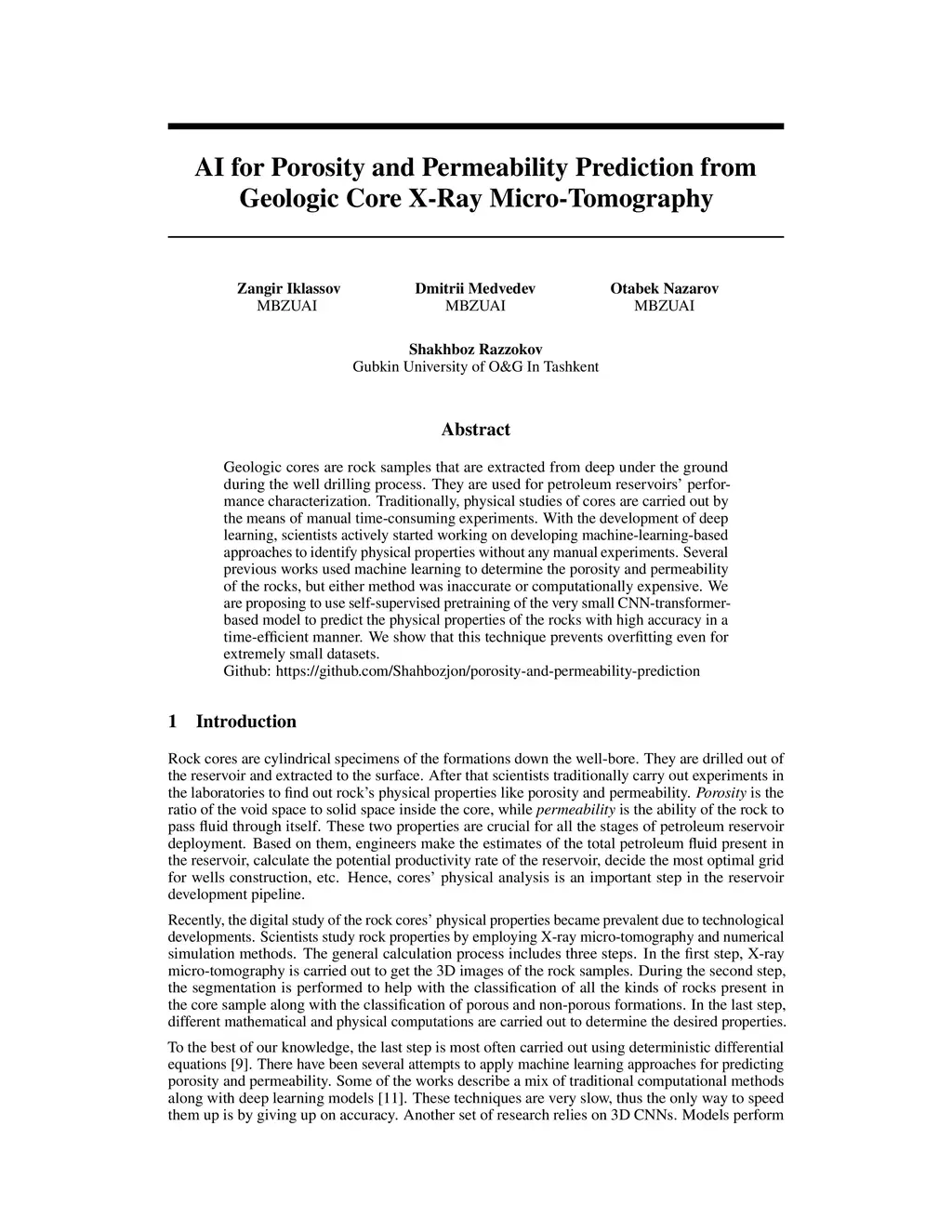 Geologic cores are rock samples that are extracted from deep under the ground during the well drilling process. They are used for petroleum reservoirs' performance characterization. Traditionally, physical studies of cores are carried out by the means of manual time-consuming experiments. With the development of deep learning, scientists actively started working on developing machine-learning-based approaches to identify physical properties without any manual experiments. Several previous works used machine learning to determine the porosity and permeability of the rocks, but either method was inaccurate or computationally expensive. We are proposing to use self-supervised pretraining of the very small CNN-transformer-based model to predict the physical properties of the rocks with high accuracy in a time-efficient manner. We show that this technique prevents overfitting even for extremely small datasets. Github: https://github.com/Shahbozjon/porosity-and-permeability-prediction