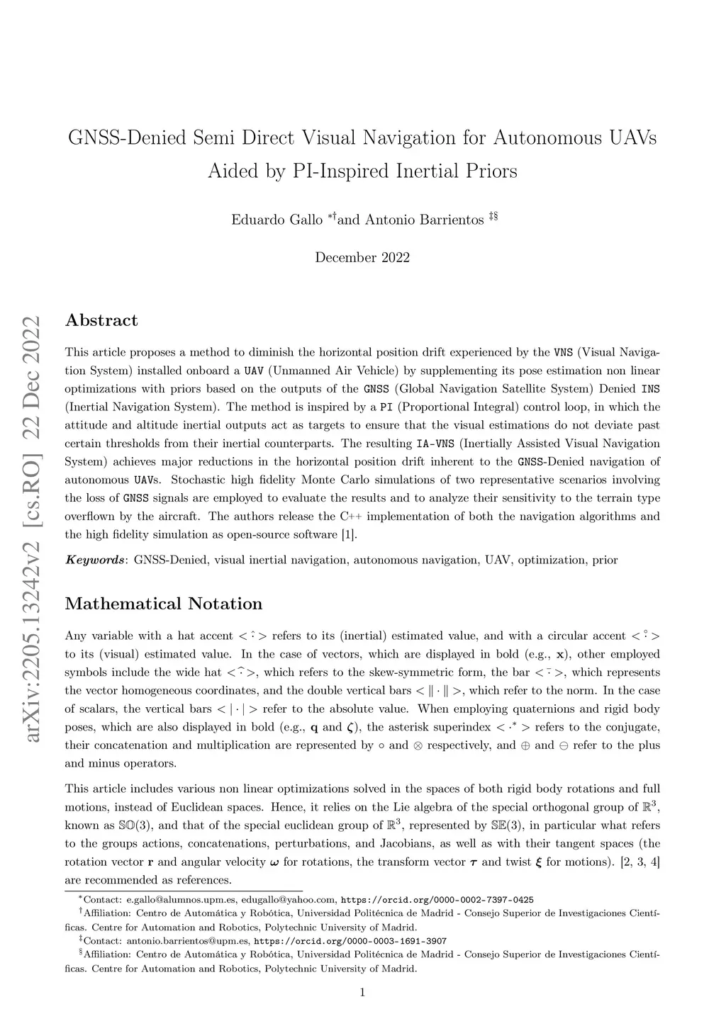 GNSS-Denied Semi Direct Visual Navigation for Autonomous UAVs Aided by