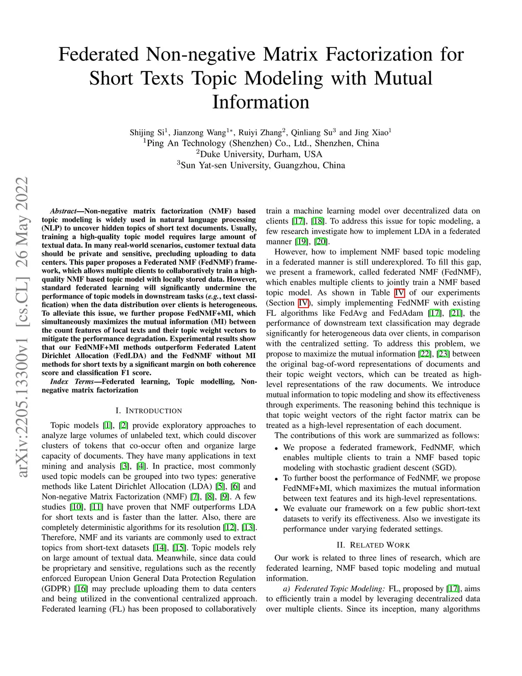 Non-negative matrix factorization (NMF) based topic modeling is widely used in natural language processing (NLP) to uncover hidden topics of short text documents. Usually, training a high-quality topic model requires large amount of textual data. In many real-world scenarios, customer textual data should be private and sensitive, precluding uploading to data centers. This paper proposes a Federated NMF (FedNMF) framework, which allows multiple clients to collaboratively train a high-quality NMF based topic model with locally stored data. However, standard federated learning will significantly undermine the performance of topic models in downstream tasks (e.g., text classification) when the data distribution over clients is heterogeneous. To alleviate this issue, we further propose FedNMF+MI, which simultaneously maximizes the mutual information (MI) between the count features of local texts and their topic weight vectors to mitigate the performance degradation. Experimental results show that our FedNMF+MI methods outperform Federated Latent Dirichlet Allocation (FedLDA) and the FedNMF without MI methods for short texts by a significant margin on both coherence score and classification F1 score.