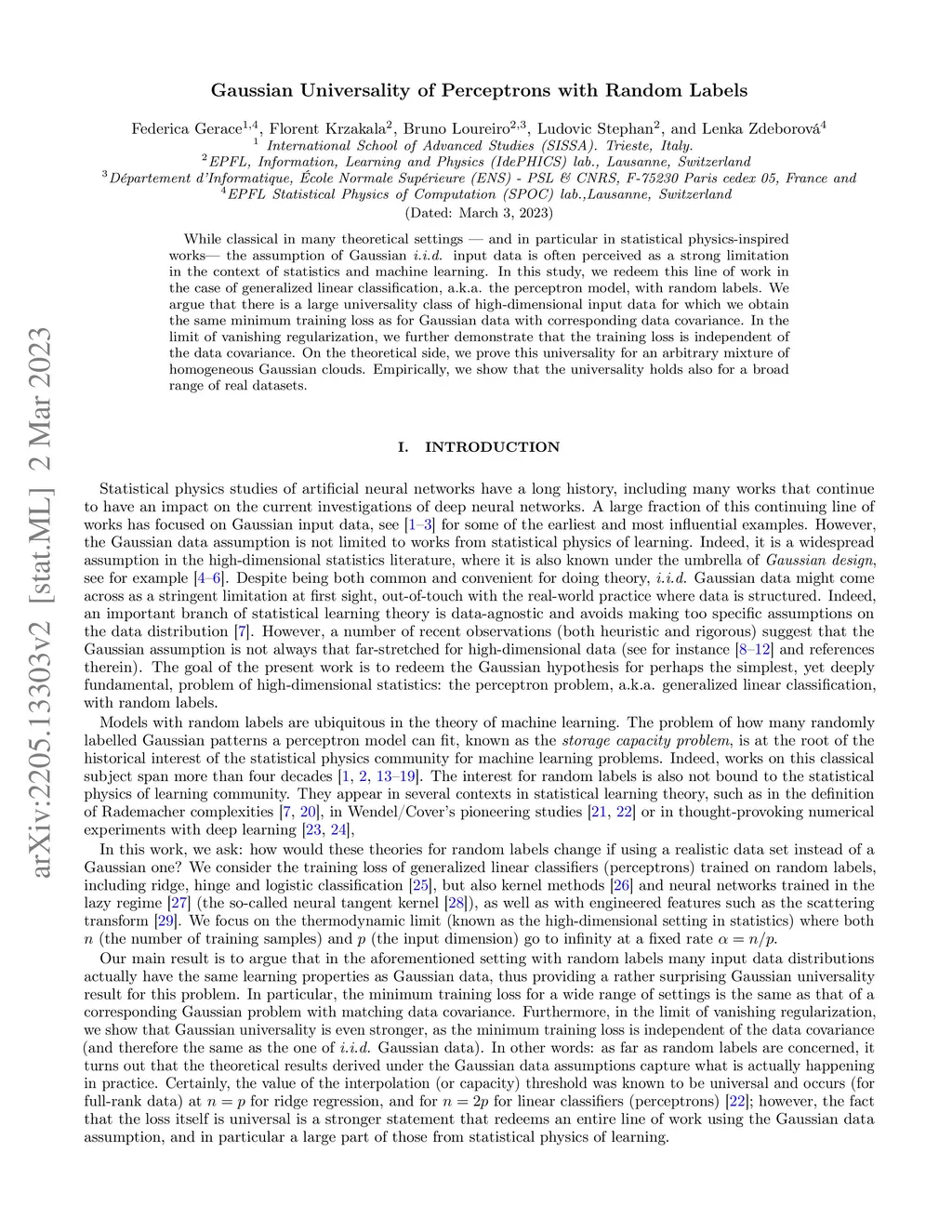 While classical in many theoretical settings - and in particular in statistical physics-inspired works - the assumption of Gaussian i.i.d. input data is often perceived as a strong limitation in the context of statistics and machine learning. In this study, we redeem this line of work in the case of generalized linear classification, a.k.a. the perceptron model, with random labels. We argue that there is a large universality class of high-dimensional input data for which we obtain the same minimum training loss as for Gaussian data with corresponding data covariance. In the limit of vanishing regularization, we further demonstrate that the training loss is independent of the data covariance. On the theoretical side, we prove this universality for an arbitrary mixture of homogeneous Gaussian clouds. Empirically, we show that the universality holds also for a broad range of real datasets.