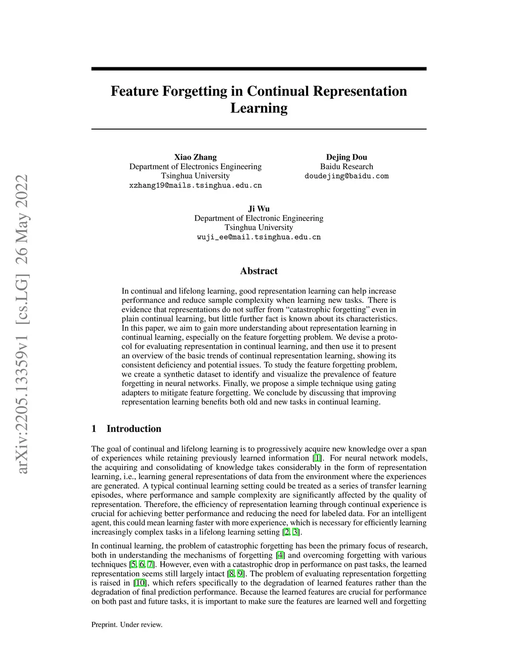 In continual and lifelong learning, good representation learning can help increase performance and reduce sample complexity when learning new tasks. There is evidence that representations do not suffer from "catastrophic forgetting" even in plain continual learning, but little further fact is known about its characteristics. In this paper, we aim to gain more understanding about representation learning in continual learning, especially on the feature forgetting problem. We devise a protocol for evaluating representation in continual learning, and then use it to present an overview of the basic trends of continual representation learning, showing its consistent deficiency and potential issues. To study the feature forgetting problem, we create a synthetic dataset to identify and visualize the prevalence of feature forgetting in neural networks. Finally, we propose a simple technique using gating adapters to mitigate feature forgetting. We conclude by discussing that improving representation learning benefits both old and new tasks in continual learning.