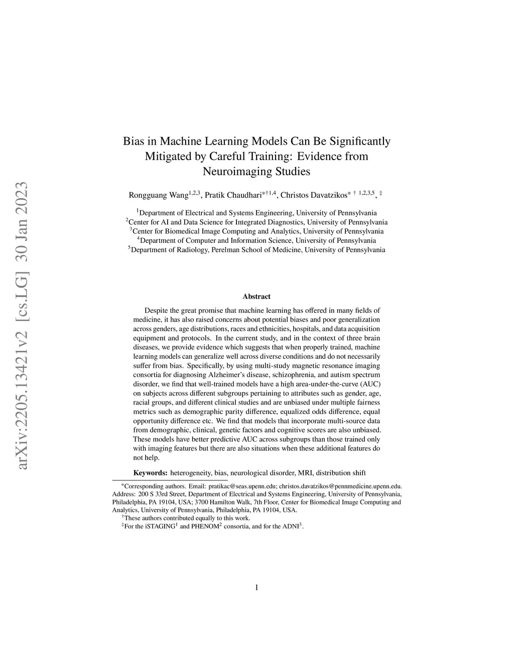 Despite the great promise that machine learning has offered in many fields of medicine, it has also raised concerns about potential biases and poor generalization across genders, age distributions, races and ethnicities, hospitals, and data acquisition equipment and protocols. In the current study, and in the context of three brain diseases, we provide evidence which suggests that when properly trained, machine learning models can generalize well across diverse conditions and do not necessarily suffer from bias. Specifically, by using multi-study magnetic resonance imaging consortia for diagnosing Alzheimer's disease, schizophrenia, and autism spectrum disorder, we find that well-trained models have a high area-under-the-curve (AUC) on subjects across different subgroups pertaining to attributes such as gender, age, racial groups, and different clinical studies and are unbiased under multiple fairness metrics such as demographic parity difference, equalized odds difference, equal opportunity difference etc. We find that models that incorporate multi-source data from demographic, clinical, genetic factors and cognitive scores are also unbiased. These models have better predictive AUC across subgroups than those trained only with imaging features but there are also situations when these additional features do not help.