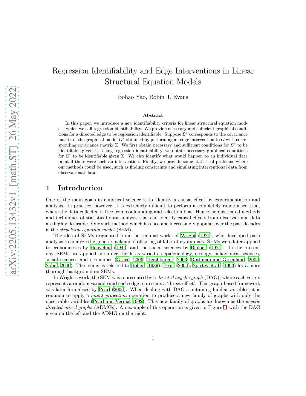 In this paper, we introduce a new identifiability criteria for linear structural equation models, which we call regression identifiability. We provide necessary and sufficient graphical conditions for a directed edge to be regression identifiable. Suppose corresponds to the covariance matrix of the graphical model obtained by performing an edge intervention to with corresponding covariance matrix . We first obtain necessary and sufficient conditions for to be identifiable given . Using regression identifiability, we obtain necessary graphical conditions for to be identifiable given . We also identify what would happen to an individual data point if there were such an intervention. Finally, we provide some statistical problems where our methods could be used, such as finding constraints and simulating interventional data from observational data.