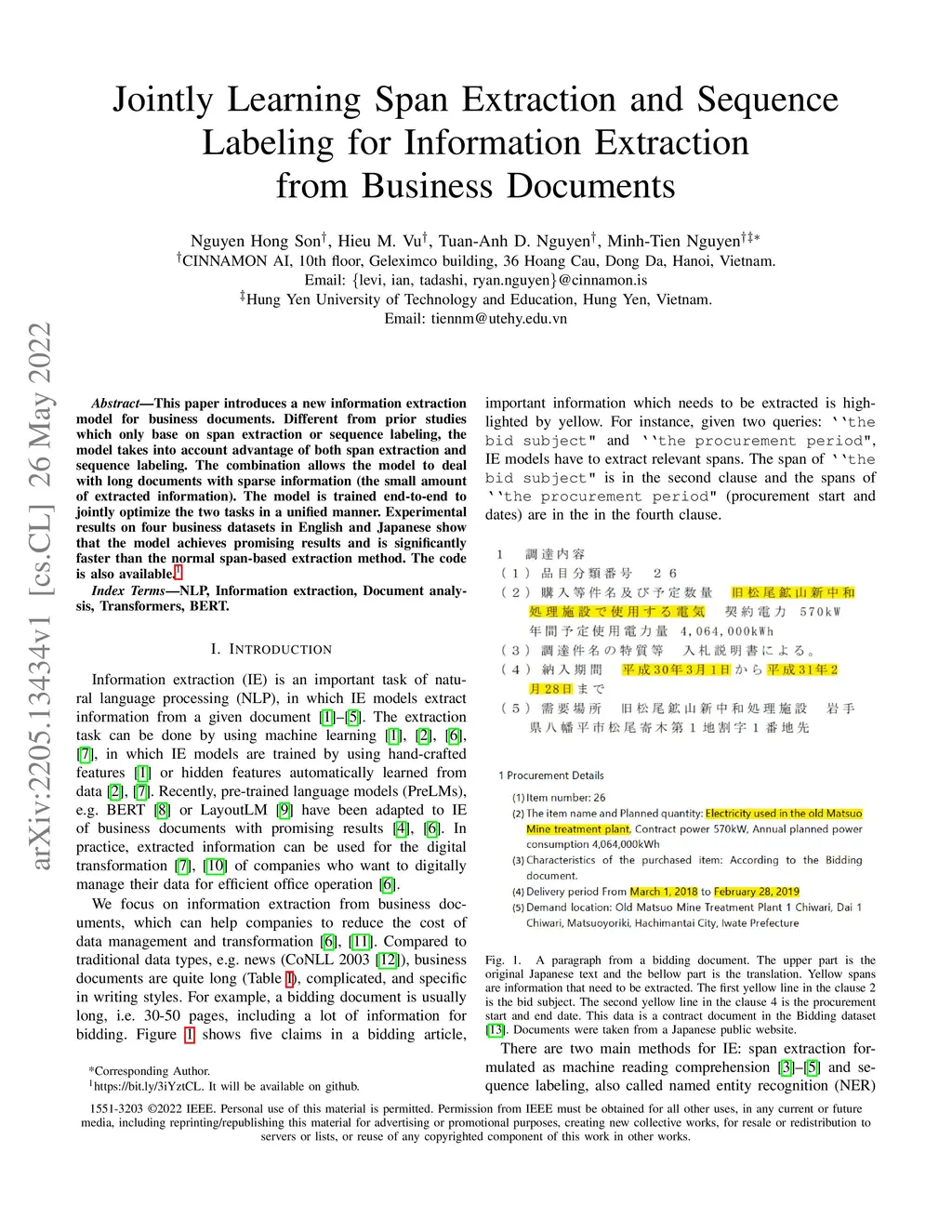 This paper introduces a new information extraction model for business documents. Different from prior studies which only base on span extraction or sequence labeling, the model takes into account advantage of both span extraction and sequence labeling. The combination allows the model to deal with long documents with sparse information (the small amount of extracted information). The model is trained end-to-end to jointly optimize the two tasks in a unified manner. Experimental results on four business datasets in English and Japanese show that the model achieves promising results and is significantly faster than the normal span-based extraction method. The code is also available.