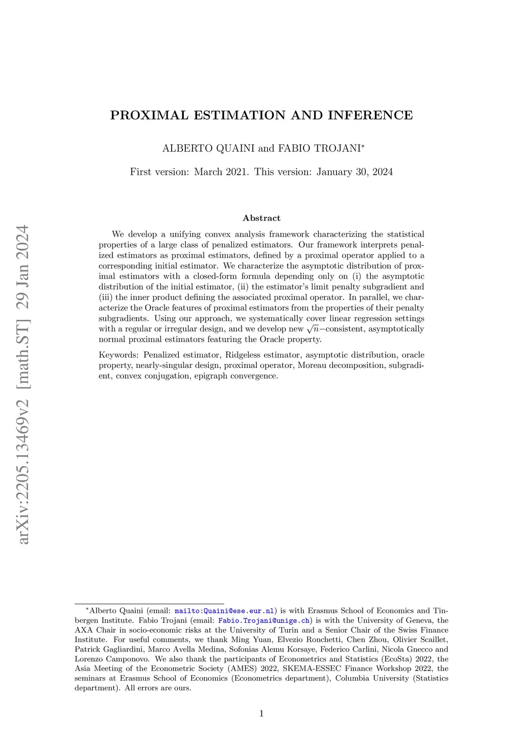 We build a unifying convex analysis framework characterizing the statistical properties of a large class of penalized estimators, both under a regular and an irregular design. Our framework interprets penalized estimators as proximal estimators, defined by a proximal operator applied to a corresponding initial estimator. We characterize the asymptotic properties of proximal estimators, showing that their asymptotic distribution follows a closed-form formula depending only on (i) the asymptotic distribution of the initial estimator, (ii) the estimator's limit penalty subgradient and (iii) the inner product defining the associated proximal operator. In parallel, we characterize the Oracle features of proximal estimators from the properties of their penalty's subgradients. We exploit our approach to systematically cover linear regression settings with a regular or irregular design. For these settings, we build new n\sqrt{n}-consistent, asymptotically normal Ridgeless-type proximal estimators, which feature the Oracle property and are shown to perform satisfactorily in practically relevant Monte Carlo settings.