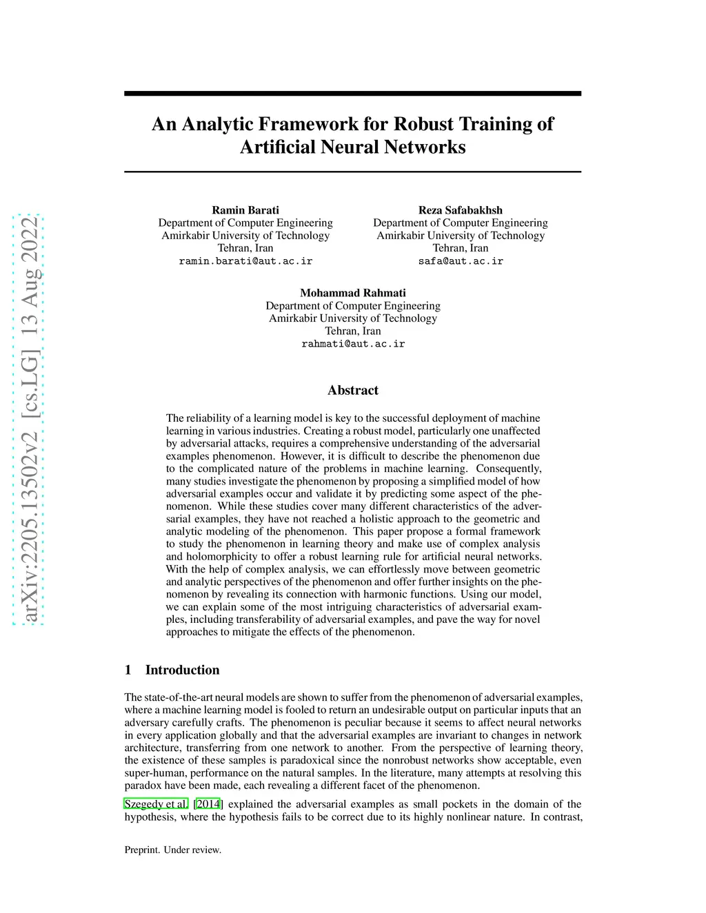 The reliability of a learning model is key to the successful deployment of machine learning in various industries. Creating a robust model, particularly one unaffected by adversarial attacks, requires a comprehensive understanding of the adversarial examples phenomenon. However, it is difficult to describe the phenomenon due to the complicated nature of the problems in machine learning. Consequently, many studies investigate the phenomenon by proposing a simplified model of how adversarial examples occur and validate it by predicting some aspect of the phenomenon. While these studies cover many different characteristics of the adversarial examples, they have not reached a holistic approach to the geometric and analytic modeling of the phenomenon. This paper propose a formal framework to study the phenomenon in learning theory and make use of complex analysis and holomorphicity to offer a robust learning rule for artificial neural networks. With the help of complex analysis, we can effortlessly move between geometric and analytic perspectives of the phenomenon and offer further insights on the phenomenon by revealing its connection with harmonic functions. Using our model, we can explain some of the most intriguing characteristics of adversarial examples, including transferability of adversarial examples, and pave the way for novel approaches to mitigate the effects of the phenomenon.