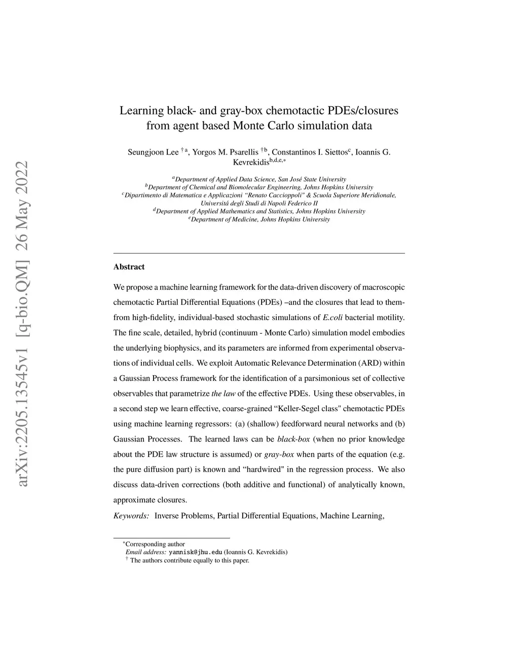 We propose a machine learning framework for the data-driven discovery of macroscopic chemotactic Partial Differential Equations (PDEs) -- and the closures that lead to them -- from high-fidelity, individual-based stochastic simulations of E.coli bacterial motility. The fine scale, detailed, hybrid (continuum - Monte Carlo) simulation model embodies the underlying biophysics, and its parameters are informed from experimental observations of individual cells. We exploit Automatic Relevance Determination (ARD) within a Gaussian Process framework for the identification of a parsimonious set of collective observables that parametrize the law of the effective PDEs. Using these observables, in a second step we learn effective, coarse-grained "Keller-Segel class" chemotactic PDEs using machine learning regressors: (a) (shallow) feedforward neural networks and (b) Gaussian Processes. The learned laws can be black-box (when no prior knowledge about the PDE law structure is assumed) or gray-box when parts of the equation (e.g. the pure diffusion part) is known and "hardwired" in the regression process. We also discuss data-driven corrections (both additive and functional) of analytically known, approximate closures.