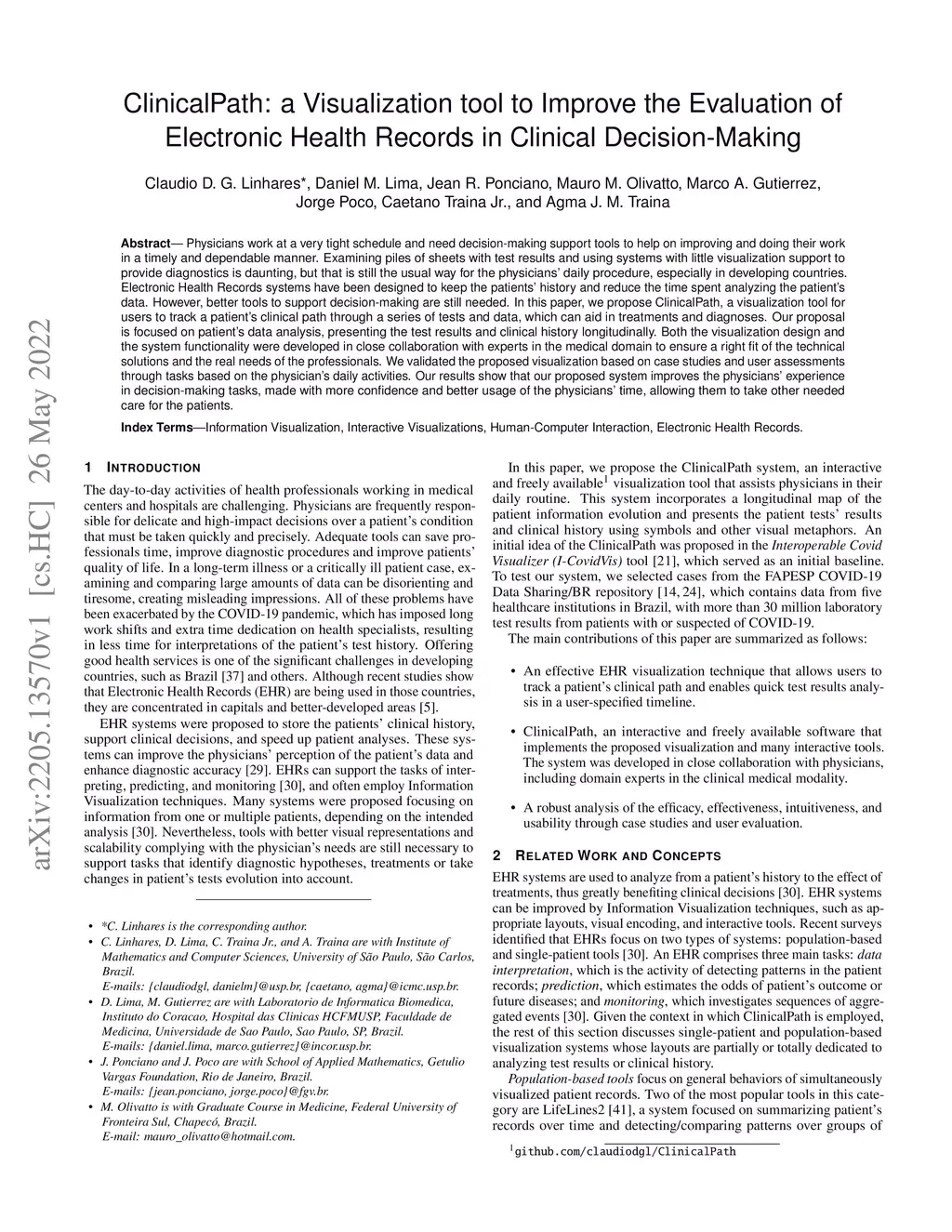 Physicians work at a very tight schedule and need decision-making support tools to help on improving and doing their work in a timely and dependable manner. Examining piles of sheets with test results and using systems with little visualization support to provide diagnostics is daunting, but that is still the usual way for the physicians' daily procedure, especially in developing countries. Electronic Health Records systems have been designed to keep the patients' history and reduce the time spent analyzing the patient's data. However, better tools to support decision-making are still needed. In this paper, we propose ClinicalPath, a visualization tool for users to track a patient's clinical path through a series of tests and data, which can aid in treatments and diagnoses. Our proposal is focused on patient's data analysis, presenting the test results and clinical history longitudinally. Both the visualization design and the system functionality were developed in close collaboration with experts in the medical domain to ensure a right fit of the technical solutions and the real needs of the professionals. We validated the proposed visualization based on case studies and user assessments through tasks based on the physician's daily activities. Our results show that our proposed system improves the physicians' experience in decision-making tasks, made with more confidence and better usage of the physicians' time, allowing them to take other needed care for the patients.