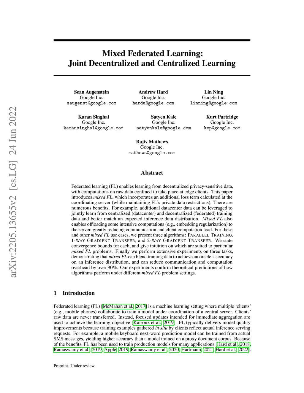 Federated learning (FL) enables learning from decentralized privacy-sensitive data, with computations on raw data confined to take place at edge clients. This paper introduces mixed FL, which incorporates an additional loss term calculated at the coordinating server (while maintaining FL's private data restrictions). There are numerous benefits. For example, additional datacenter data can be leveraged to jointly learn from centralized (datacenter) and decentralized (federated) training data and better match an expected inference data distribution. Mixed FL also enables offloading some intensive computations (e.g., embedding regularization) to the server, greatly reducing communication and client computation load. For these and other mixed FL use cases, we present three algorithms: PARALLEL TRAINING, 1-WAY GRADIENT TRANSFER, and 2-WAY GRADIENT TRANSFER. We state convergence bounds for each, and give intuition on which are suited to particular mixed FL problems. Finally we perform extensive experiments on three tasks, demonstrating that mixed FL can blend training data to achieve an oracle's accuracy on an inference distribution, and can reduce communication and computation overhead by over 90%. Our experiments confirm theoretical predictions of how algorithms perform under different mixed FL problem settings.