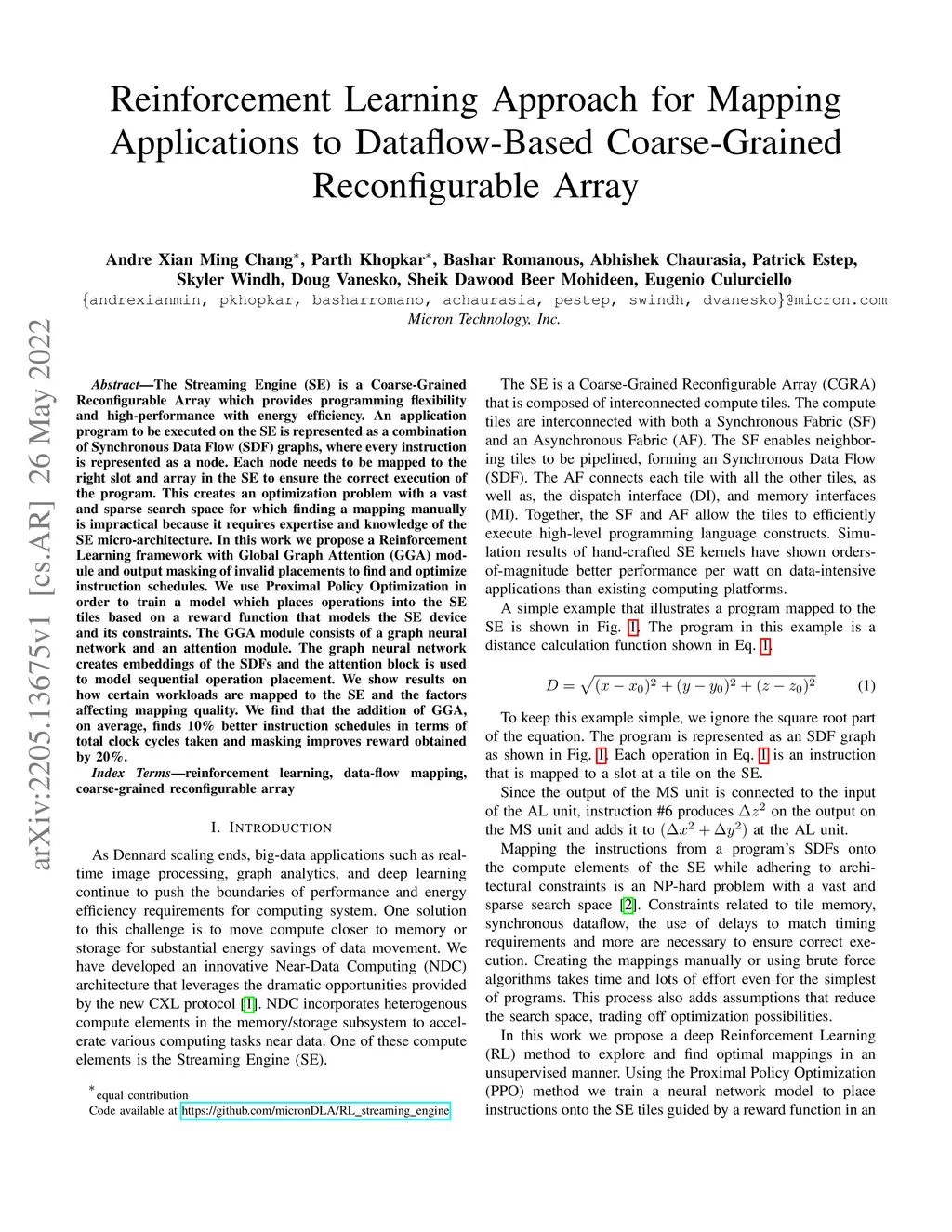 The Streaming Engine (SE) is a Coarse-Grained Reconfigurable Array which provides programming flexibility and high-performance with energy efficiency. An application program to be executed on the SE is represented as a combination of Synchronous Data Flow (SDF) graphs, where every instruction is represented as a node. Each node needs to be mapped to the right slot and array in the SE to ensure the correct execution of the program. This creates an optimization problem with a vast and sparse search space for which finding a mapping manually is impractical because it requires expertise and knowledge of the SE micro-architecture. In this work we propose a Reinforcement Learning framework with Global Graph Attention (GGA) module and output masking of invalid placements to find and optimize instruction schedules. We use Proximal Policy Optimization in order to train a model which places operations into the SE tiles based on a reward function that models the SE device and its constraints. The GGA module consists of a graph neural network and an attention module. The graph neural network creates embeddings of the SDFs and the attention block is used to model sequential operation placement. We show results on how certain workloads are mapped to the SE and the factors affecting mapping quality. We find that the addition of GGA, on average, finds 10% better instruction schedules in terms of total clock cycles taken and masking improves reward obtained by 20%.