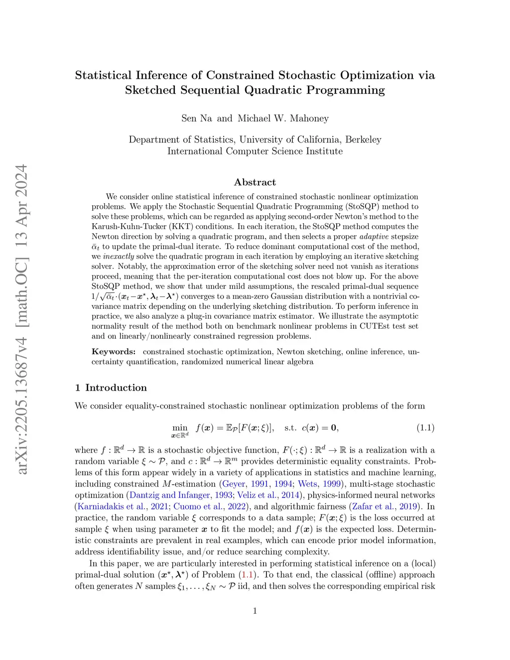 We consider online statistical inference of constrained stochastic nonlinear optimization problems. We apply the Stochastic Sequential Quadratic Programming (StoSQP) method to solve these problems, which can be regarded as applying second-order Newton's method to the Karush-Kuhn-Tucker (KKT) conditions. In each iteration, the StoSQP method computes the Newton direction by solving a quadratic program, and then selects a proper adaptive stepsize to update the primal-dual iterate. To reduce dominant computational cost of the method, we inexactly solve the quadratic program in each iteration by employing an iterative sketching solver. Notably, the approximation error of the sketching solver need not vanish as iterations proceed, meaning that the per-iteration computational cost does not blow up. For the above StoSQP method, we show that under mild assumptions, the rescaled primal-dual sequence converges to a mean-zero Gaussian distribution with a nontrivial covariance matrix depending on the underlying sketching distribution. To perform inference in practice, we also analyze a plug-in covariance matrix estimator. We illustrate the asymptotic normality result of the method both on benchmark nonlinear problems in CUTEst test set and on linearly/nonlinearly constrained regression problems.