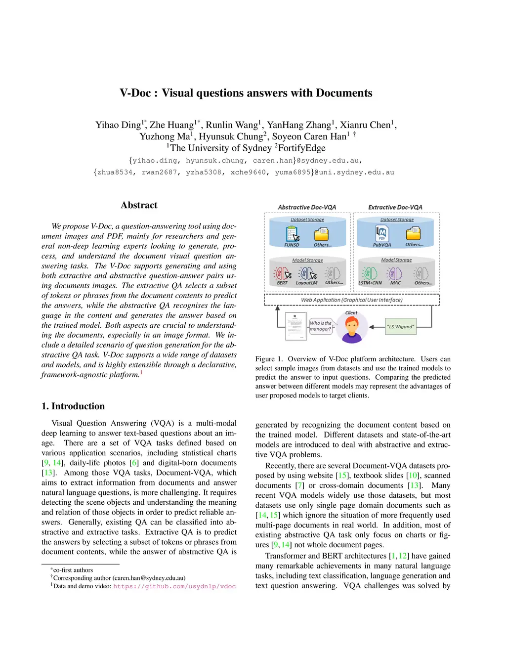 We propose V-Doc, a question-answering tool using document images and PDF, mainly for researchers and general non-deep learning experts looking to generate, process, and understand the document visual question answering tasks. The V-Doc supports generating and using both extractive and abstractive question-answer pairs using documents images. The extractive QA selects a subset of tokens or phrases from the document contents to predict the answers, while the abstractive QA recognises the language in the content and generates the answer based on the trained model. Both aspects are crucial to understanding the documents, especially in an image format. We include a detailed scenario of question generation for the abstractive QA task. V-Doc supports a wide range of datasets and models, and is highly extensible through a declarative, framework-agnostic platform.