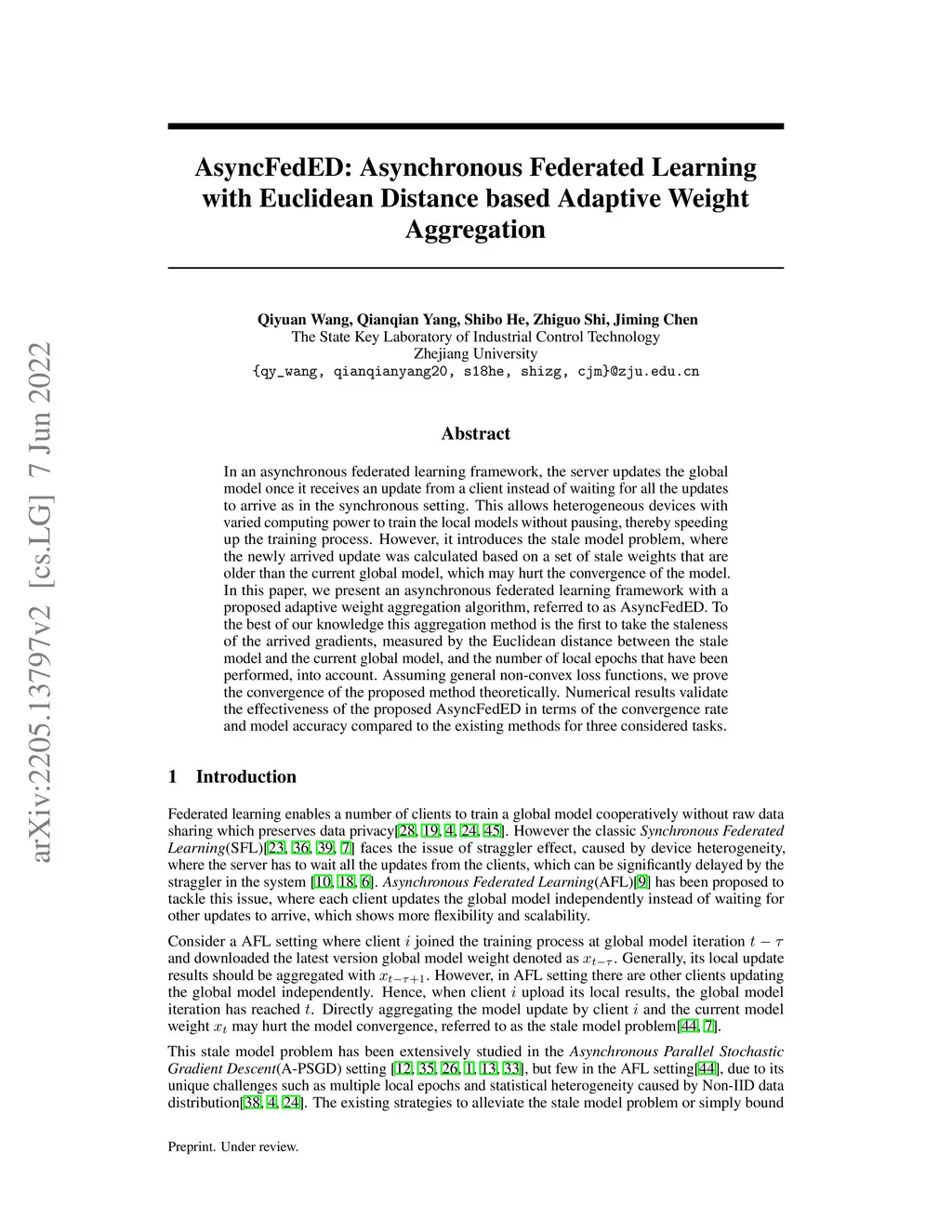 In an asynchronous federated learning framework, the server updates the global model once it receives an update from a client instead of waiting for all the updates to arrive as in the synchronous setting. This allows heterogeneous devices with varied computing power to train the local models without pausing, thereby speeding up the training process. However, it introduces the stale model problem, where the newly arrived update was calculated based on a set of stale weights that are older than the current global model, which may hurt the convergence of the model. In this paper, we present an asynchronous federated learning framework with a proposed adaptive weight aggregation algorithm, referred to as AsyncFedED. To the best of our knowledge this aggregation method is the first to take the staleness of the arrived gradients, measured by the Euclidean distance between the stale model and the current global model, and the number of local epochs that have been performed, into account. Assuming general non-convex loss functions, we prove the convergence of the proposed method theoretically. Numerical results validate the effectiveness of the proposed AsyncFedED in terms of the convergence rate and model accuracy compared to the existing methods for three considered tasks.