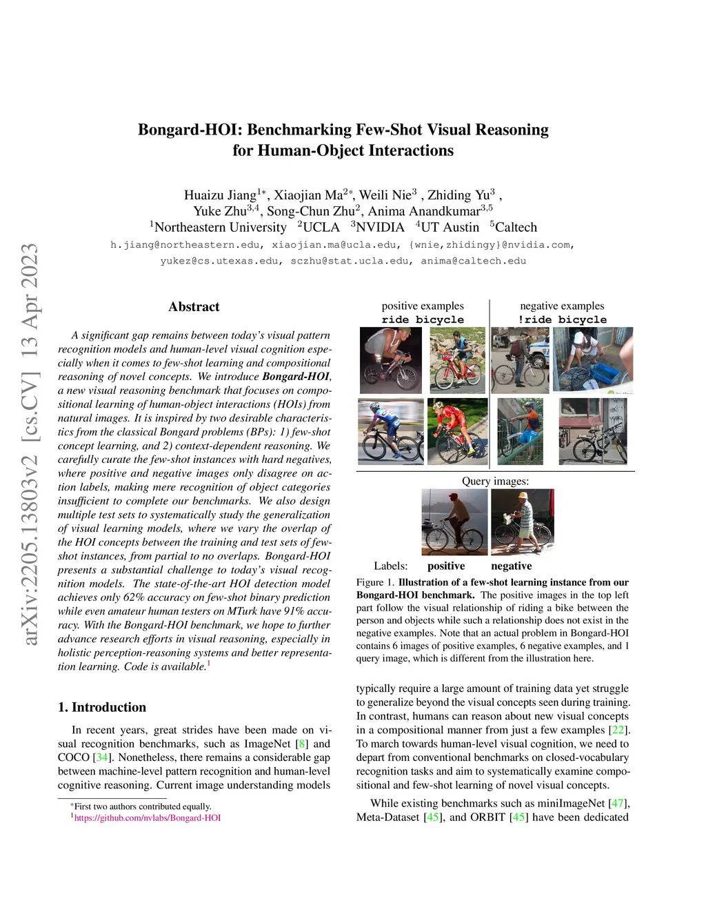 A significant gap remains between today's visual pattern recognition models and human-level visual cognition especially when it comes to few-shot learning and compositional reasoning of novel concepts. We introduce Bongard-HOI, a new visual reasoning benchmark that focuses on compositional learning of human-object interactions (HOIs) from natural images. It is inspired by two desirable characteristics from the classical Bongard problems (BPs): 1) few-shot concept learning, and 2) context-dependent reasoning. We carefully curate the few-shot instances with hard negatives, where positive and negative images only disagree on action labels, making mere recognition of object categories insufficient to complete our benchmarks. We also design multiple test sets to systematically study the generalization of visual learning models, where we vary the overlap of the HOI concepts between the training and test sets of few-shot instances, from partial to no overlaps. Bongard-HOI presents a substantial challenge to today's visual recognition models. The state-of-the-art HOI detection model achieves only 62% accuracy on few-shot binary prediction while even amateur human testers on MTurk have 91% accuracy. With the Bongard-HOI benchmark, we hope to further advance research efforts in visual reasoning, especially in holistic perception-reasoning systems and better representation learning.