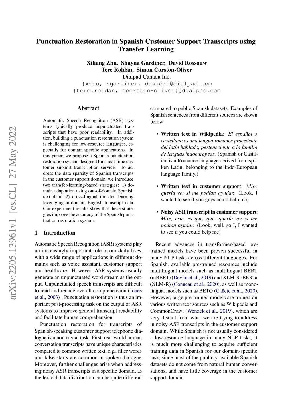 Punctuation Restoration in Spanish Customer Support Transcripts using
