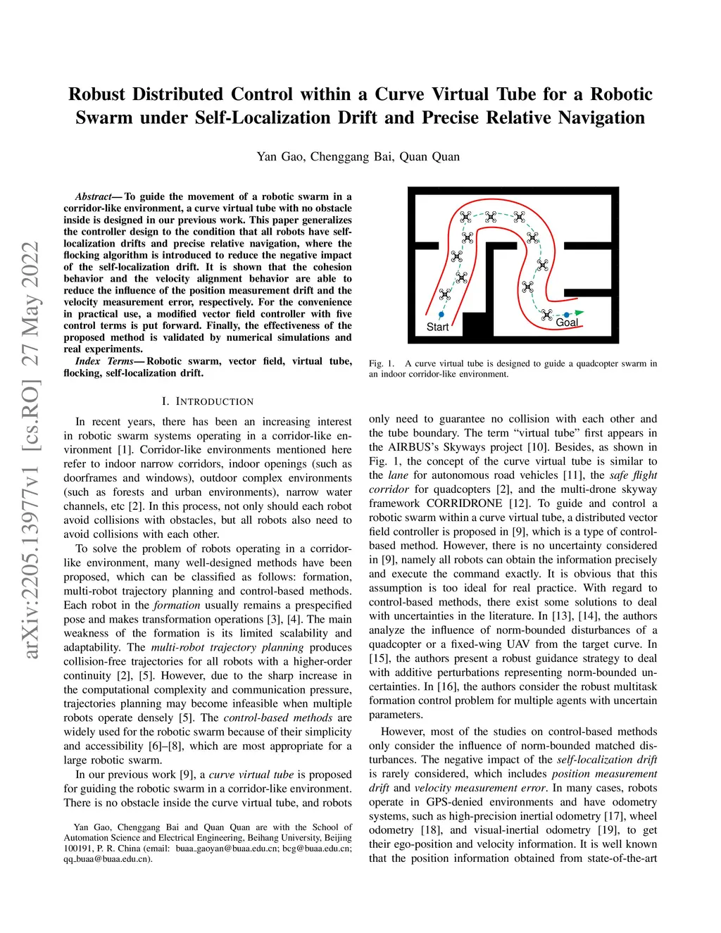 To guide the movement of a robotic swarm in a corridor-like environment, a curve virtual tube with no obstacle inside is designed in our previous work. This paper generalizes the controller design to the condition that all robots have self-localization drifts and precise relative navigation, where the flocking algorithm is introduced to reduce the negative impact of the self-localization drift. It is shown that the cohesion behavior and the velocity alignment behavior are able to reduce the influence of the position measurement drift and the velocity measurement error, respectively. For the convenience in practical use, a modified vector field controller with five control terms is put forward. Finally, the effectiveness of the proposed method is validated by numerical simulations and real experiments.