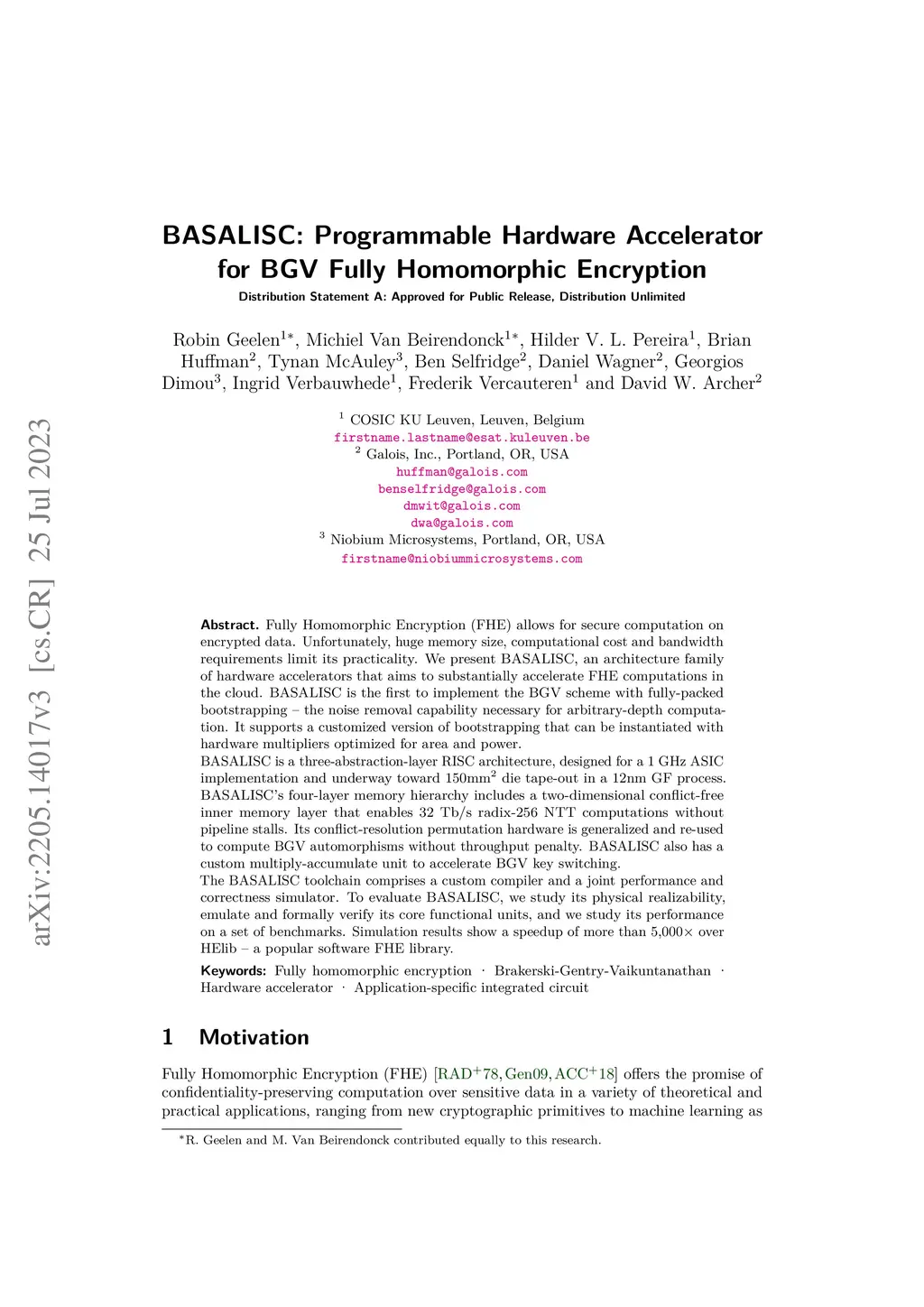 Fully Homomorphic Encryption (FHE) allows for secure computation on encrypted data. Unfortunately, huge memory size, computational cost and bandwidth requirements limit its practicality. We present BASALISC, an architecture family of hardware accelerators that aims to substantially accelerate FHE computations in the cloud. BASALISC is the first to implement the BGV scheme with fully-packed bootstrapping -- the noise removal capability necessary for arbitrary-depth computation. It supports a customized version of bootstrapping that can be instantiated with hardware multipliers optimized for area and power. BASALISC is a three-abstraction-layer RISC architecture, designed for a 1 GHz ASIC implementation and underway toward 150mm2 die tape-out in a 12nm GF process. BASALISC's four-layer memory hierarchy includes a two-dimensional conflict-free inner memory layer that enables 32 Tb/s radix-256 NTT computations without pipeline stalls. Its conflict-resolution permutation hardware is generalized and re-used to compute BGV automorphisms without throughput penalty. BASALISC also has a custom multiply-accumulate unit to accelerate BGV key switching. The BASALISC toolchain comprises a custom compiler and a joint performance and correctness simulator. To evaluate BASALISC, we study its physical realizability, emulate and formally verify its core functional units, and we study its performance on a set of benchmarks. Simulation results show a speedup of more than 5,000 times over HElib -- a popular software FHE library.