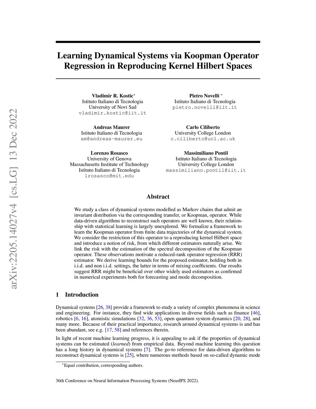 We study a class of dynamical systems modelled as Markov chains that admit an invariant distribution via the corresponding transfer, or Koopman, operator. While data-driven algorithms to reconstruct such operators are well known, their relationship with statistical learning is largely unexplored. We formalize a framework to learn the Koopman operator from finite data trajectories of the dynamical system. We consider the restriction of this operator to a reproducing kernel Hilbert space and introduce a notion of risk, from which different estimators naturally arise. We link the risk with the estimation of the spectral decomposition of the Koopman operator. These observations motivate a reduced-rank operator regression (RRR) estimator. We derive learning bounds for the proposed estimator, holding both in i.i.d. and non i.i.d. settings, the latter in terms of mixing coefficients. Our results suggest RRR might be beneficial over other widely used estimators as confirmed in numerical experiments both for forecasting and mode decomposition.