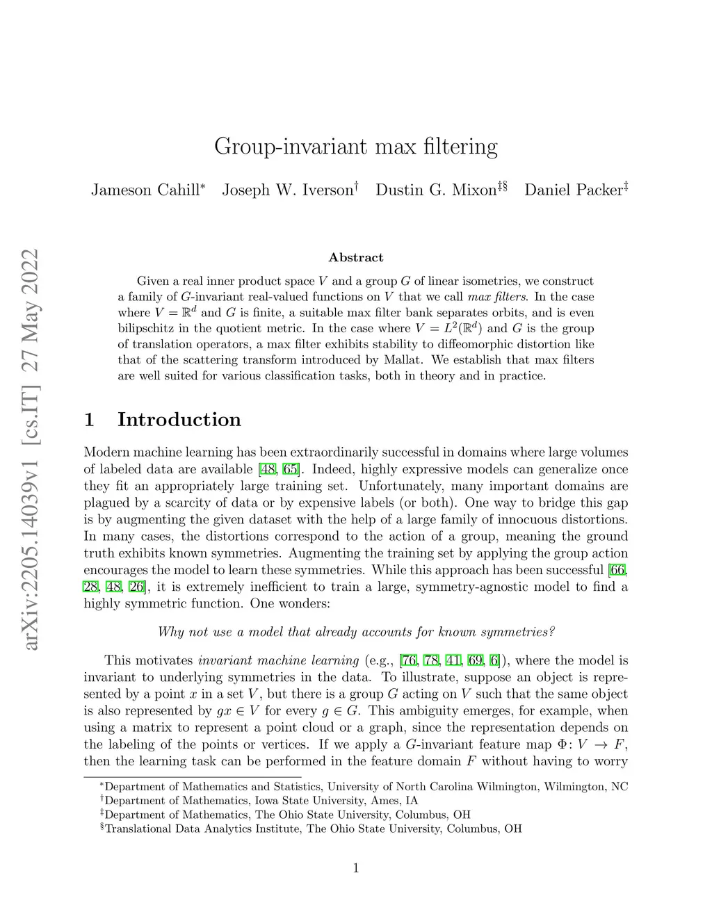 Given a real inner product space and a group of linear isometries, we construct a family of -invariant real-valued functions on that we call max filters. In the case where and is finite, a suitable max filter bank separates orbits, and is even bilipschitz in the quotient metric. In the case where and is the group of translation operators, a max filter exhibits stability to diffeomorphic distortion like that of the scattering transform introduced by Mallat. We establish that max filters are well suited for various classification tasks, both in theory and in practice.