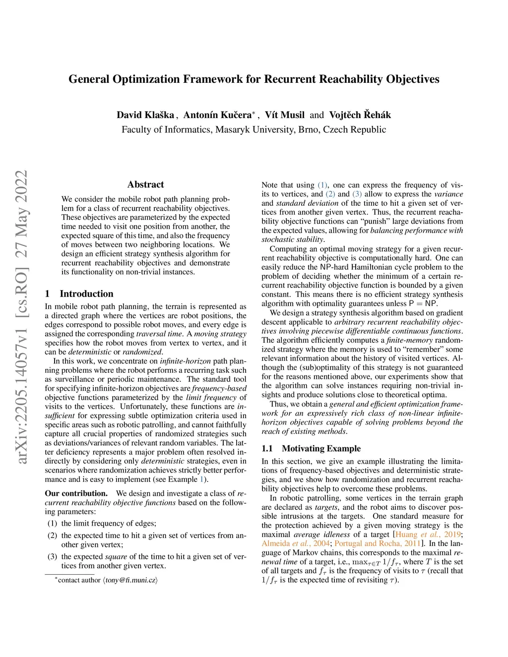 We consider the mobile robot path planning problem for a class of recurrent reachability objectives. These objectives are parameterized by the expected time needed to visit one position from another, the expected square of this time, and also the frequency of moves between two neighboring locations. We design an efficient strategy synthesis algorithm for recurrent reachability objectives and demonstrate its functionality on non-trivial instances.