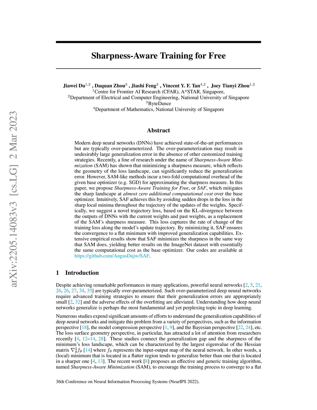 Modern deep neural networks (DNNs) have achieved state-of-the-art performances but are typically over-parameterized. The over-parameterization may result in undesirably large generalization error in the absence of other customized training strategies. Recently, a line of research under the name of Sharpness-Aware Minimization (SAM) has shown that minimizing a sharpness measure, which reflects the geometry of the loss landscape, can significantly reduce the generalization error. However, SAM-like methods incur a two-fold computational overhead of the given base optimizer (e.g. SGD) for approximating the sharpness measure. In this paper, we propose Sharpness-Aware Training for Free, or SAF, which mitigates the sharp landscape at almost zero additional computational cost over the base optimizer. Intuitively, SAF achieves this by avoiding sudden drops in the loss in the sharp local minima throughout the trajectory of the updates of the weights. Specifically, we suggest a novel trajectory loss, based on the KL-divergence between the outputs of DNNs with the current weights and past weights, as a replacement of the SAM's sharpness measure. This loss captures the rate of change of the training loss along the model's update trajectory. By minimizing it, SAF ensures the convergence to a flat minimum with improved generalization capabilities. Extensive empirical results show that SAF minimizes the sharpness in the same way that SAM does, yielding better results on the ImageNet dataset with essentially the same computational cost as the base optimizer.