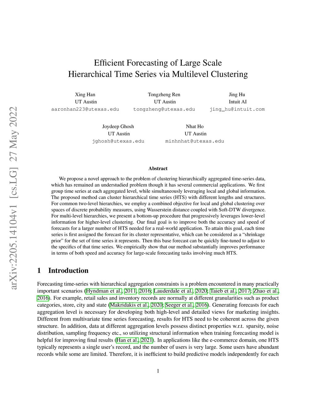 We propose a novel approach to the problem of clustering hierarchically aggregated time-series data, which has remained an understudied problem though it has several commercial applications. We first group time series at each aggregated level, while simultaneously leveraging local and global information. The proposed method can cluster hierarchical time series (HTS) with different lengths and structures. For common two-level hierarchies, we employ a combined objective for local and global clustering over spaces of discrete probability measures, using Wasserstein distance coupled with Soft-DTW divergence. For multi-level hierarchies, we present a bottom-up procedure that progressively leverages lower-level information for higher-level clustering. Our final goal is to improve both the accuracy and speed of forecasts for a larger number of HTS needed for a real-world application. To attain this goal, each time series is first assigned the forecast for its cluster representative, which can be considered as a "shrinkage prior" for the set of time series it represents. Then this base forecast can be quickly fine-tuned to adjust to the specifics of that time series. We empirically show that our method substantially improves performance in terms of both speed and accuracy for large-scale forecasting tasks involving much HTS.