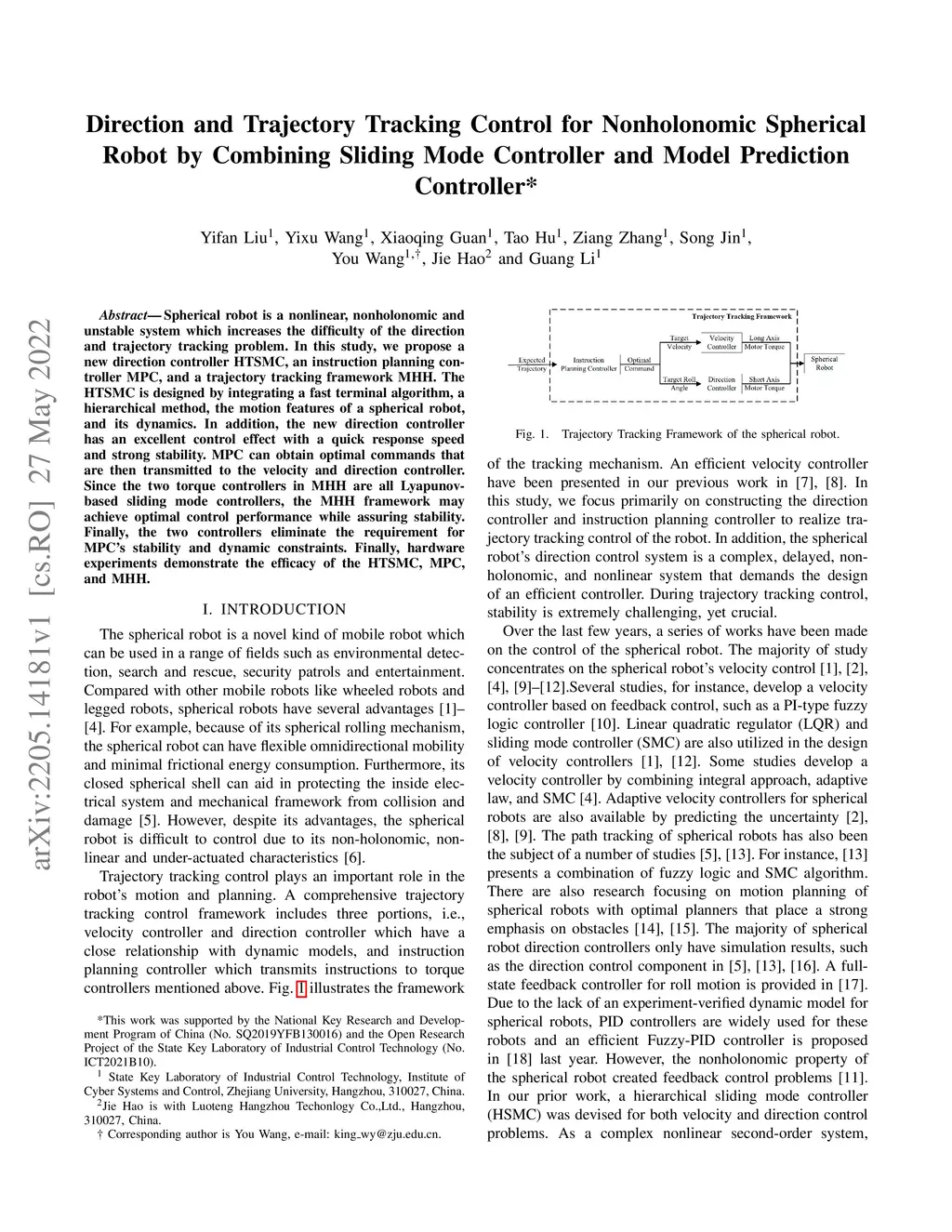 Spherical robot is a nonlinear, nonholonomic and unstable system which increases the difficulty of the direction and trajectory tracking problem. In this study, we propose a new direction controller HTSMC, an instruction planning controller MPC, and a trajectory tracking framework MHH. The HTSMC is designed by integrating a fast terminal algorithm, a hierarchical method, the motion features of a spherical robot, and its dynamics. In addition, the new direction controller has an excellent control effect with a quick response speed and strong stability. MPC can obtain optimal commands that are then transmitted to the velocity and direction controller. Since the two torque controllers in MHH are all Lyapunov-based sliding mode controllers, the MHH framework may achieve optimal control performance while assuring stability. Finally, the two controllers eliminate the requirement for MPC's stability and dynamic constraints. Finally, hardware experiments demonstrate the efficacy of the HTSMC, MPC, and MHH.