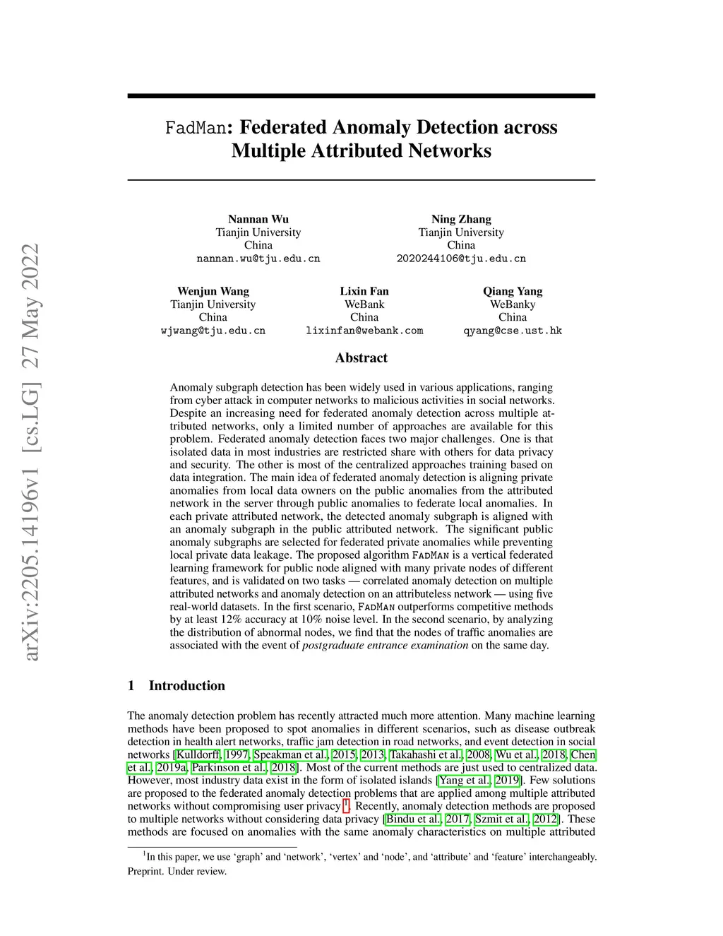 Anomaly subgraph detection has been widely used in various applications, ranging from cyber attack in computer networks to malicious activities in social networks. Despite an increasing need for federated anomaly detection across multiple attributed networks, only a limited number of approaches are available for this problem. Federated anomaly detection faces two major challenges. One is that isolated data in most industries are restricted share with others for data privacy and security. The other is most of the centralized approaches training based on data integration. The main idea of federated anomaly detection is aligning private anomalies from local data owners on the public anomalies from the attributed network in the server through public anomalies to federate local anomalies. In each private attributed network, the detected anomaly subgraph is aligned with an anomaly subgraph in the public attributed network. The significant public anomaly subgraphs are selected for federated private anomalies while preventing local private data leakage. The proposed algorithm FadMan is a vertical federated learning framework for public node aligned with many private nodes of different features, and is validated on two tasks correlated anomaly detection on multiple attributed networks and anomaly detection on an attributeless network using five real-world datasets. In the first scenario, FadMan outperforms competitive methods by at least 12% accuracy at 10% noise level. In the second scenario, by analyzing the distribution of abnormal nodes, we find that the nodes of traffic anomalies are associated with the event of postgraduate entrance examination on the same day.