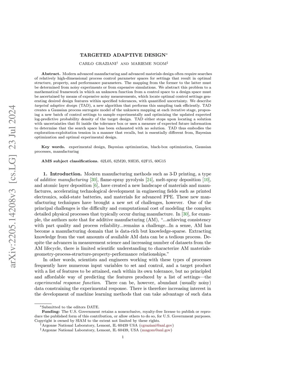 Modern advanced manufacturing and advanced materials design often require searches of relatively high-dimensional process control parameter spaces for settings that result in optimal structure, property, and performance parameters. The mapping from the former to the latter must be determined from noisy experiments or from expensive simulations. We abstract this problem to a mathematical framework in which an unknown function from a control space to a design space must be ascertained by means of expensive noisy measurements, which locate optimal control settings generating desired design features within specified tolerances, with quantified uncertainty. We describe targeted adaptive design (TAD), a new algorithm that performs this sampling task efficiently. TAD creates a Gaussian process surrogate model of the unknown mapping at each iterative stage, proposing a new batch of control settings to sample experimentally and optimizing the updated log-predictive likelihood of the target design. TAD either stops upon locating a solution with uncertainties that fit inside the tolerance box or uses a measure of expected future information to determine that the search space has been exhausted with no solution. TAD thus embodies the exploration-exploitation tension in a manner that recalls, but is essentially different from, Bayesian optimization and optimal experimental design.