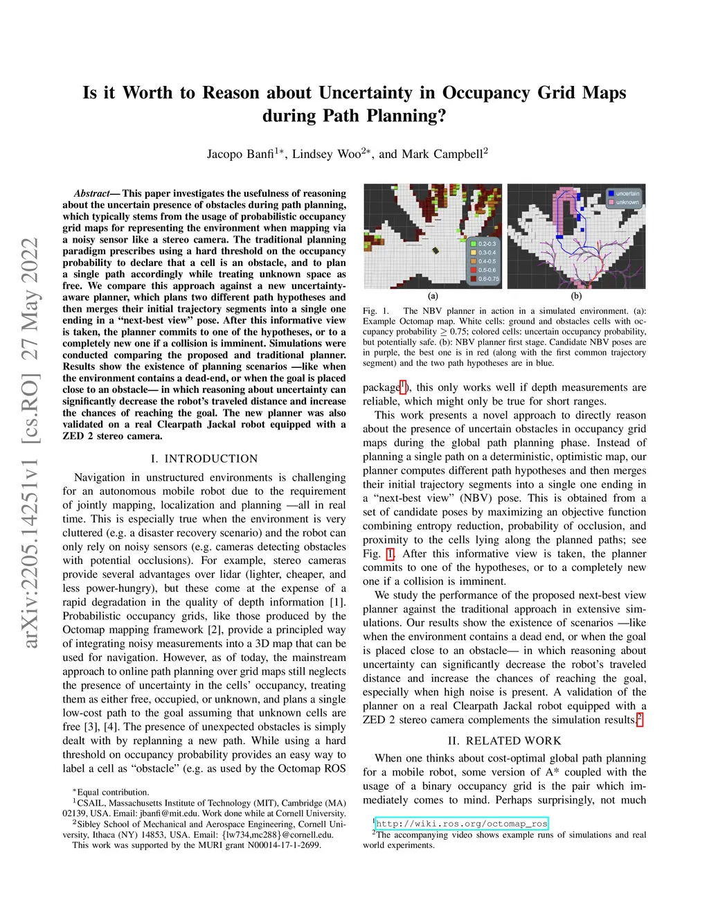 This paper investigates the usefulness of reasoning about the uncertain presence of obstacles during path planning, which typically stems from the usage of probabilistic occupancy grid maps for representing the environment when mapping via a noisy sensor like a stereo camera. The traditional planning paradigm prescribes using a hard threshold on the occupancy probability to declare that a cell is an obstacle, and to plan a single path accordingly while treating unknown space as free. We compare this approach against a new uncertainty-aware planner, which plans two different path hypotheses and then merges their initial trajectory segments into a single one ending in a "next-best view" pose. After this informative view is taken, the planner commits to one of the hypotheses, or to a completely new one if a collision is imminent. Simulations were conducted comparing the proposed and traditional planner. Results show the existence of planning scenarios -- like when the environment contains a dead-end, or when the goal is placed close to an obstacle -- in which reasoning about uncertainty can significantly decrease the robot's traveled distance and increase the chances of reaching the goal. The new planner was also validated on a real Clearpath Jackal robot equipped with a ZED 2 stereo camera.