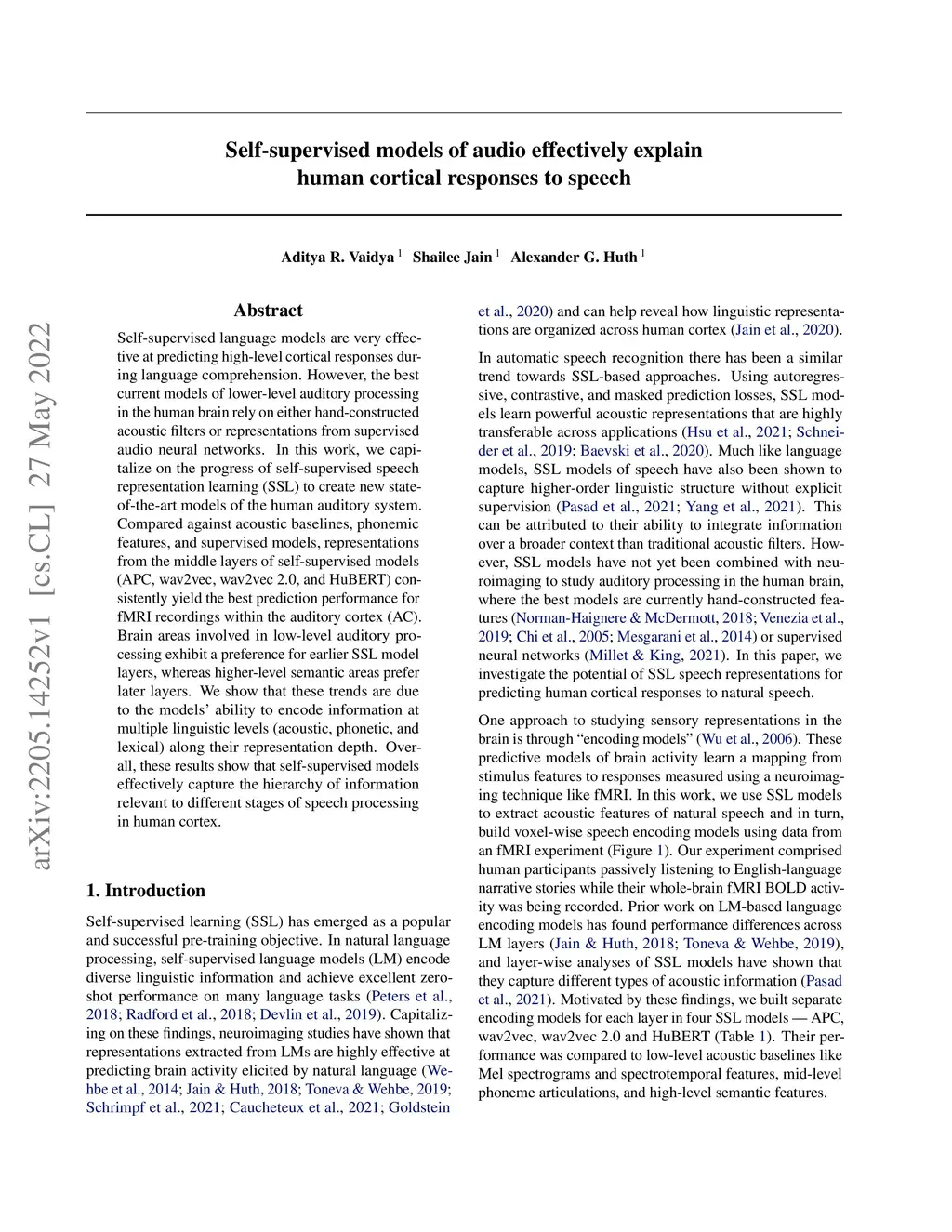 Self-supervised language models are very effective at predicting high-level cortical responses during language comprehension. However, the best current models of lower-level auditory processing in the human brain rely on either hand-constructed acoustic filters or representations from supervised audio neural networks. In this work, we capitalize on the progress of self-supervised speech representation learning (SSL) to create new state-of-the-art models of the human auditory system. Compared against acoustic baselines, phonemic features, and supervised models, representations from the middle layers of self-supervised models (APC, wav2vec, wav2vec 2.0, and HuBERT) consistently yield the best prediction performance for fMRI recordings within the auditory cortex (AC). Brain areas involved in low-level auditory processing exhibit a preference for earlier SSL model layers, whereas higher-level semantic areas prefer later layers. We show that these trends are due to the models' ability to encode information at multiple linguistic levels (acoustic, phonetic, and lexical) along their representation depth. Overall, these results show that self-supervised models effectively capture the hierarchy of information relevant to different stages of speech processing in human cortex.
